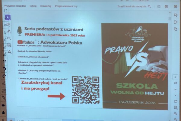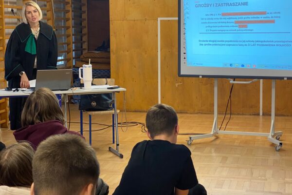 W naszej szkole odbyło się kolejne spotkanie z cyklu „Adwokaci rozjaśniają prawo”. Gościliśmy Panią Adwokat Sylwię Targońską-Kołodko, która w ciekawy i przystępny sposób opowiadała uczniom o tym, czym jest hejt, nękanie, mowa nienawiści oraz jakie mogą być konsekwencje prawne takich zachowań.