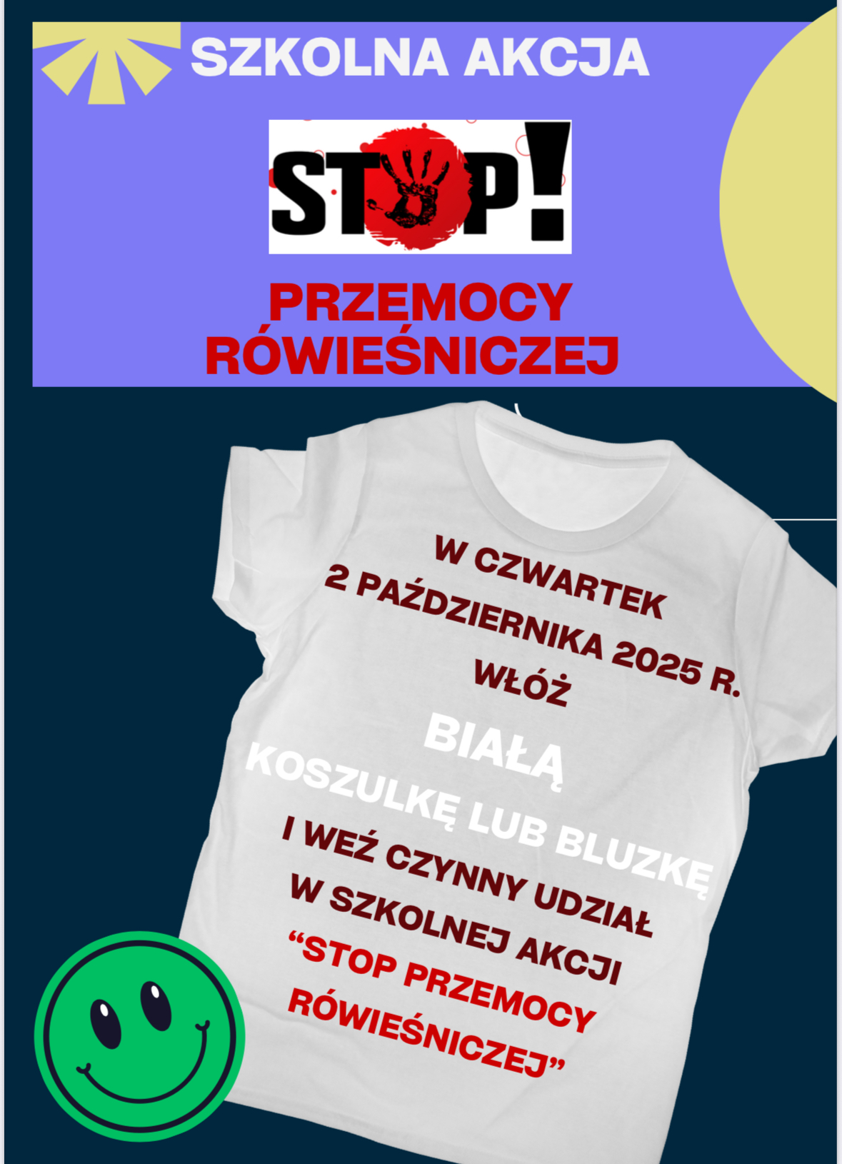 W czwartek 2 października 2025 r. włóż białą koszulkę lub bluzkę i weź czynny udział w szkolnej akcji “Stop przemocy rówieśniczej”