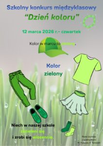 Tym razem 12 marca będziemy obchodzić dzień koloru ZIELONEGO. Zapraszamy wszystkich do czynnego udziału. Niech w naszej szkole zazieleni się i zrobi się wiosennie.