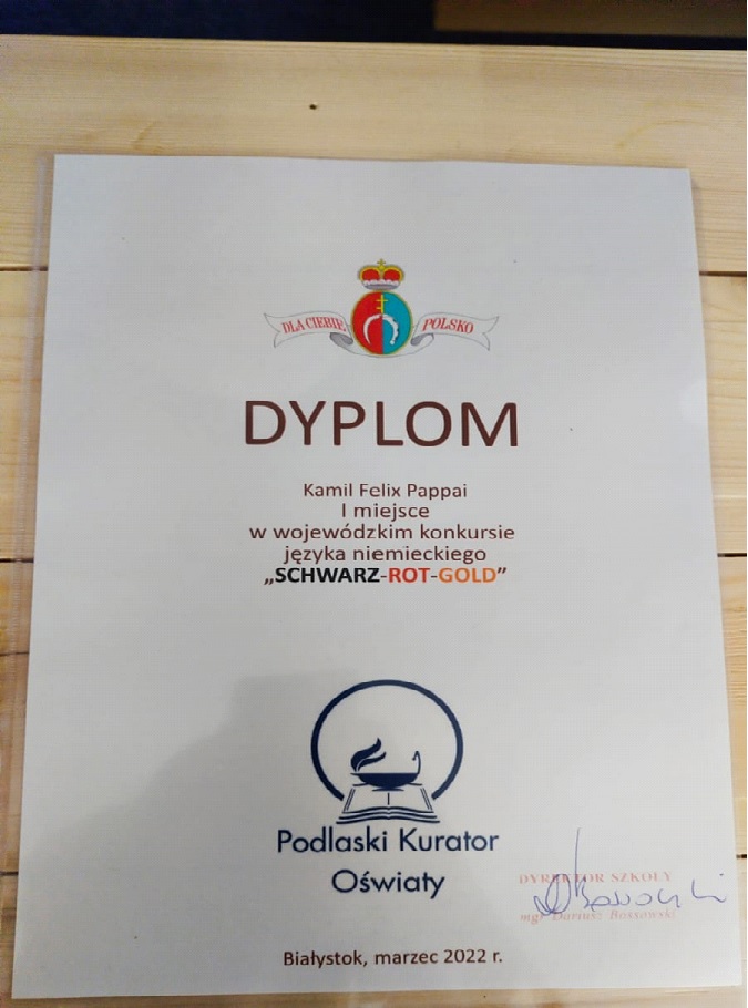 Miło nam poinformować, że uczeń klasy ósmej b Kamil Felix Pappai zdobył I miejsce w szóstej edycji konkursu germanistycznego ”SCHWARZ- ROT- GOLD”. Organizatorem konkursu o zasięgu wojewódzkim jest II LO w Białymstoku, a honorowy patronat nad konkursem sprawuje Podlaski Kurator Oświaty. Kamil otrzymał dyplom oraz nagrodę pieniężną w postaci karty podarunkowej.