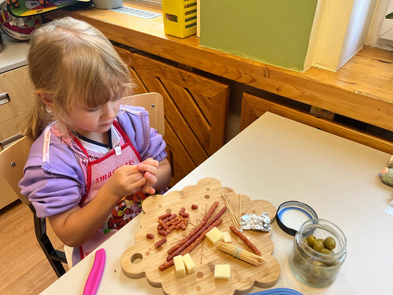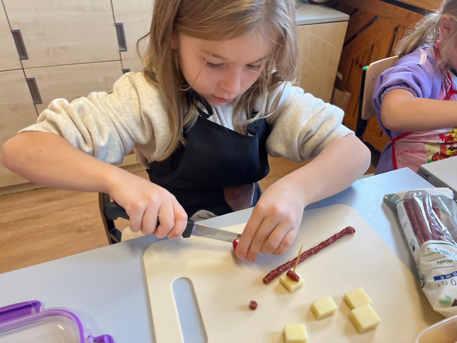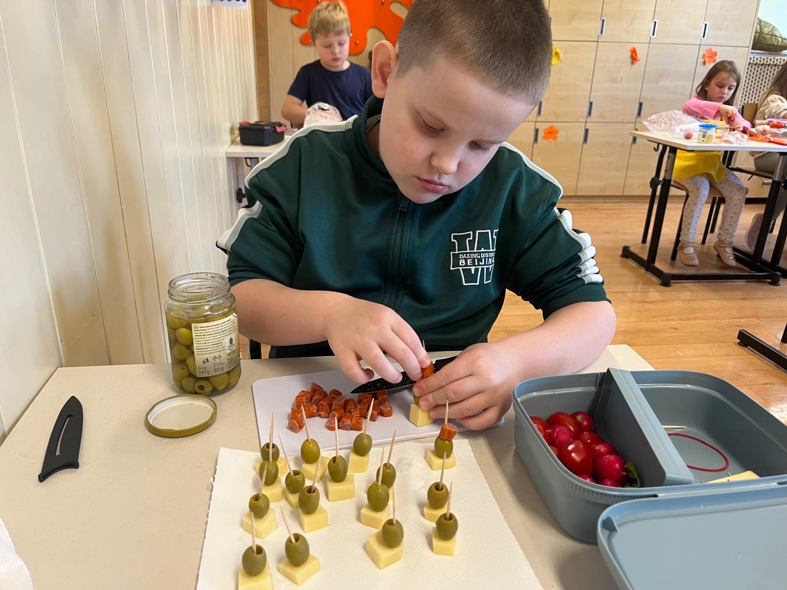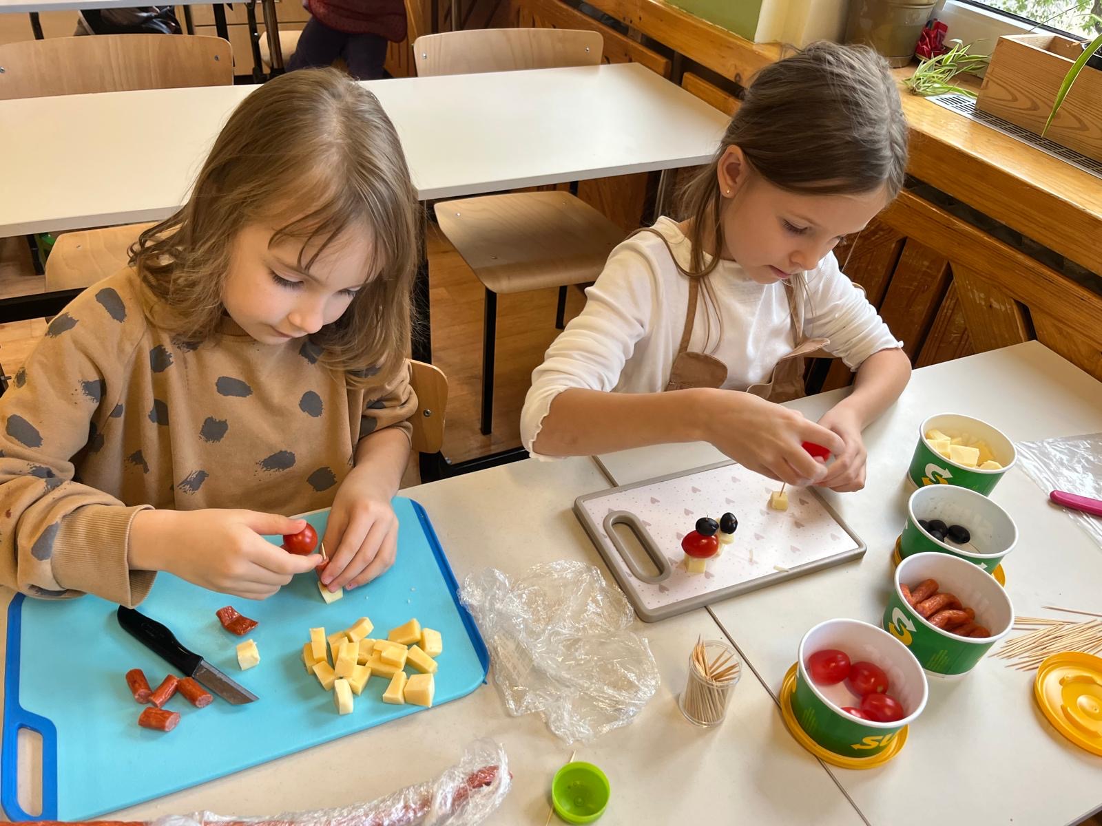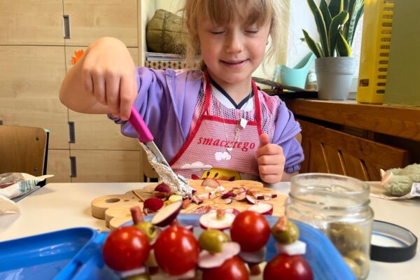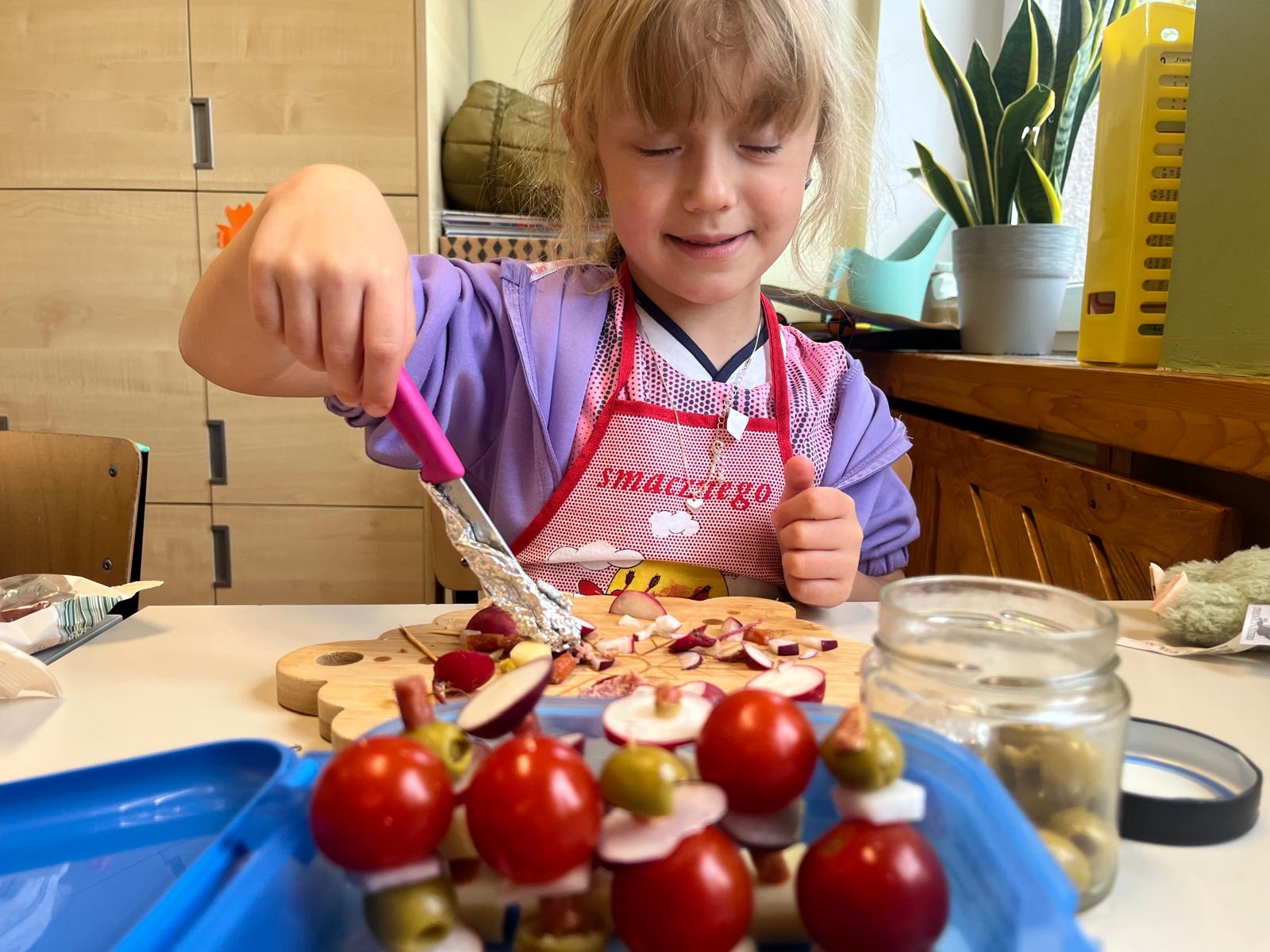 Kolorowe koreczki nie sprawiły nikomu trudności. Dzieci nawlekały kolejno na wykałaczki kosteczki żółtego sera, oliwki, kabanoski, pomidorki i rzodkiewki, jak koraliki na niteczki. Każdy miał swój pomysł, a wszystkie były wyjątkowe i pyszne.