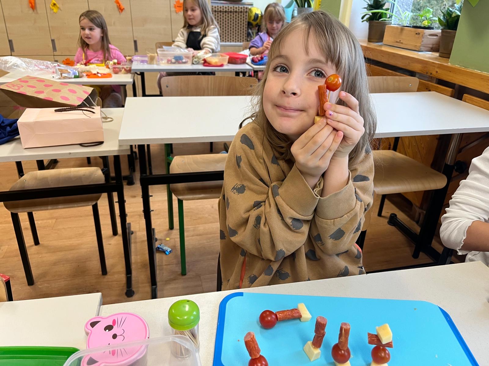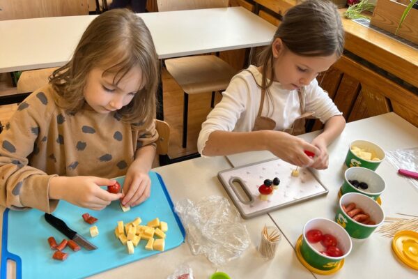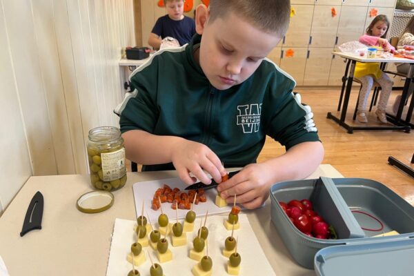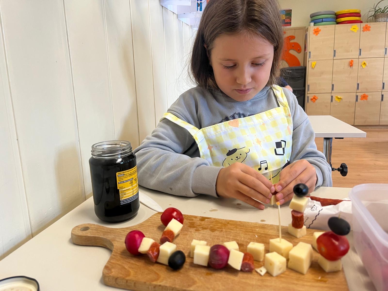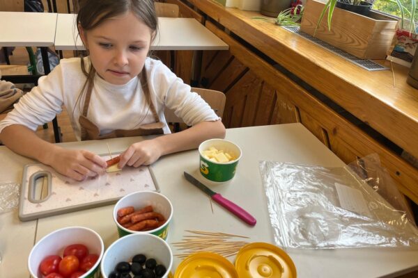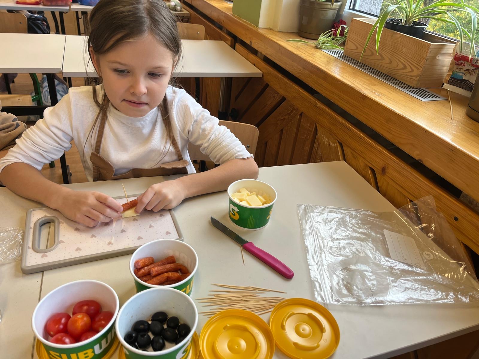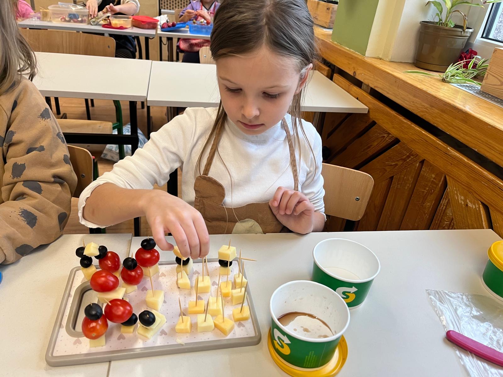 Kolorowe koreczki nie sprawiły nikomu trudności. Dzieci nawlekały kolejno na wykałaczki kosteczki żółtego sera, oliwki, kabanoski, pomidorki i rzodkiewki, jak koraliki na niteczki. Każdy miał swój pomysł, a wszystkie były wyjątkowe i pyszne.