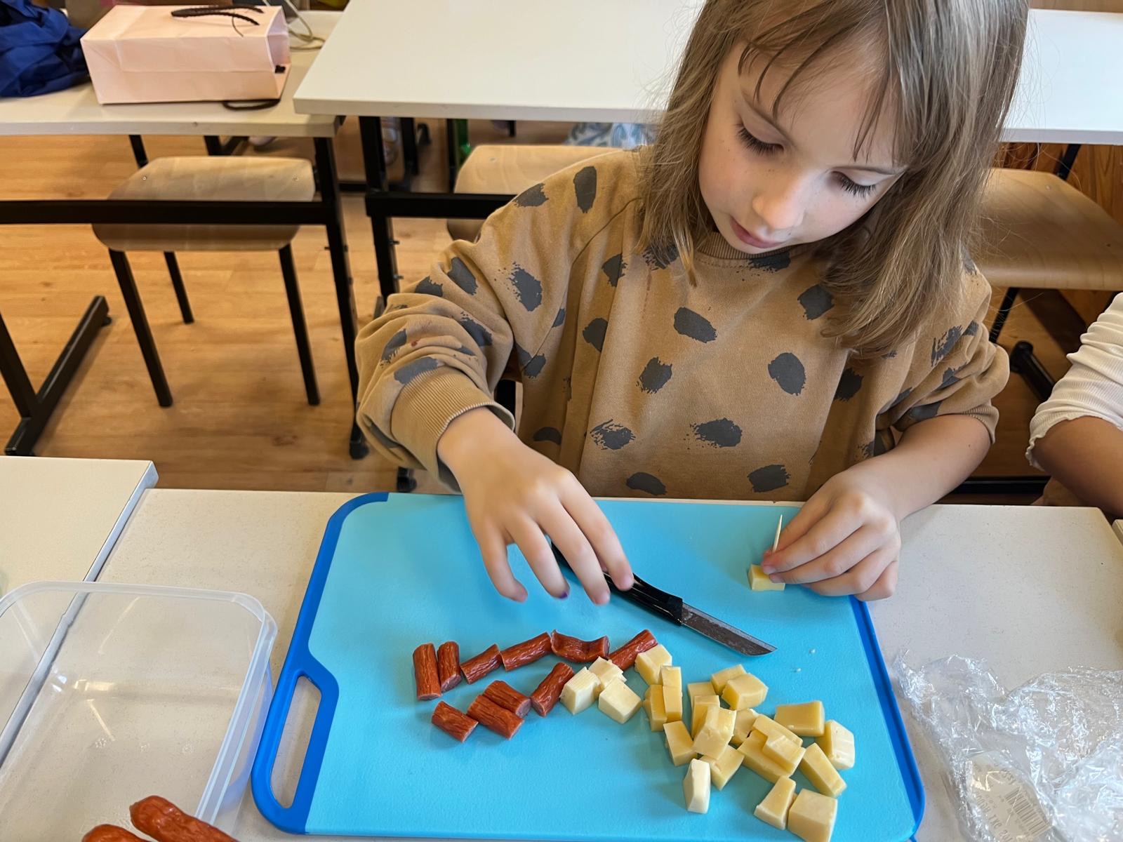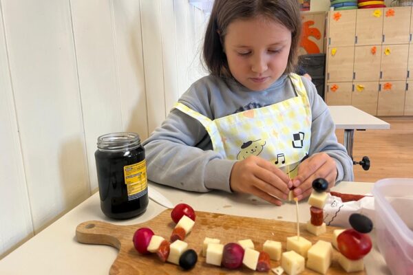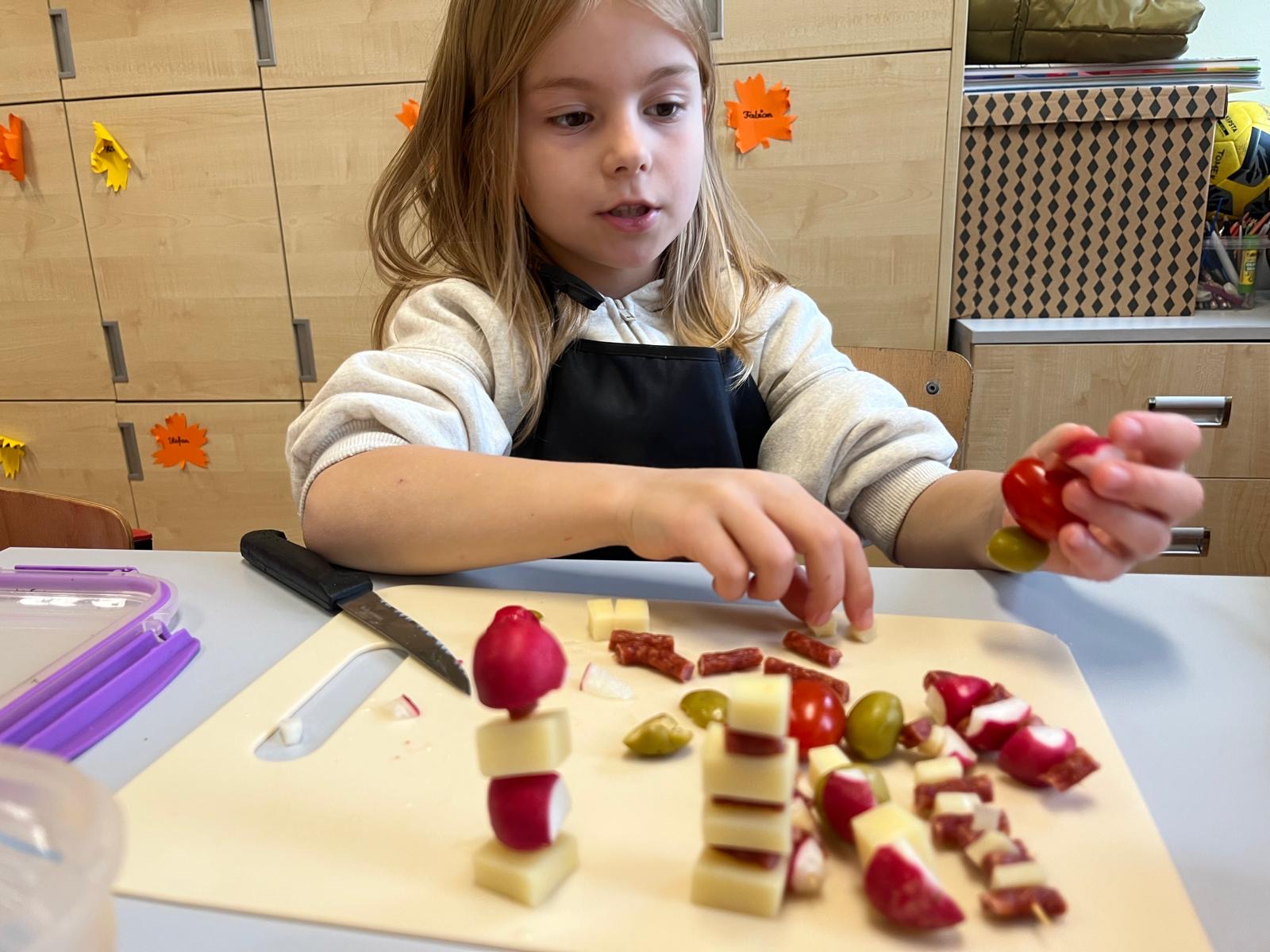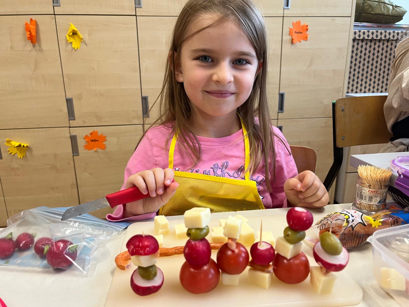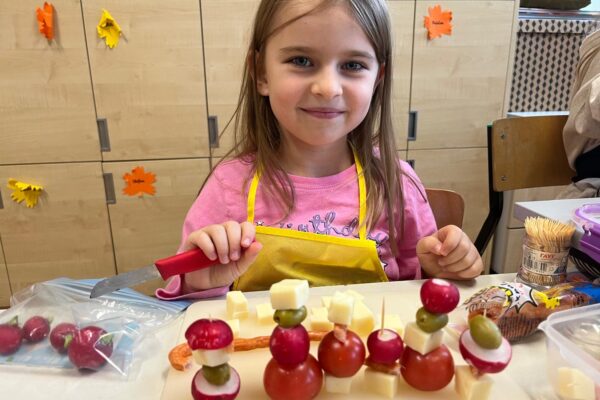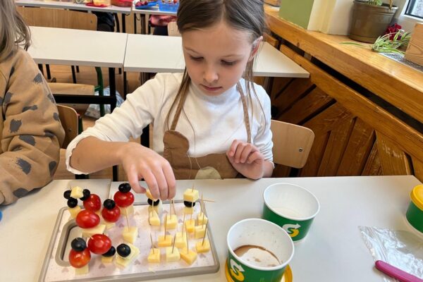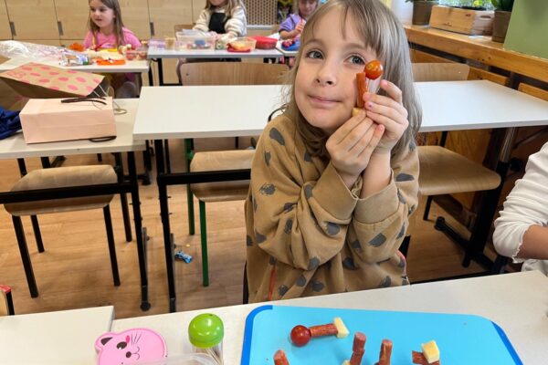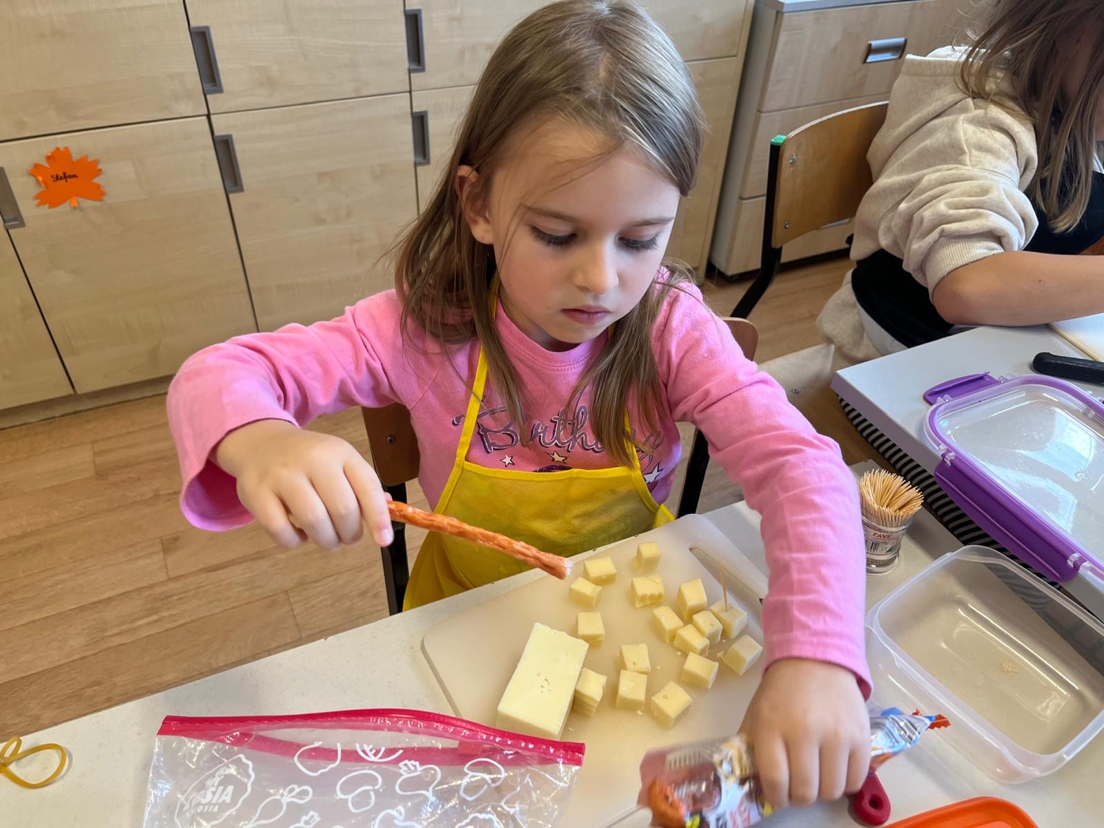Kolorowe koreczki nie sprawiły nikomu trudności. Dzieci nawlekały kolejno na wykałaczki kosteczki żółtego sera, oliwki, kabanoski, pomidorki i rzodkiewki, jak koraliki na niteczki. Każdy miał swój pomysł, a wszystkie były wyjątkowe i pyszne.