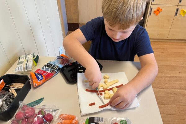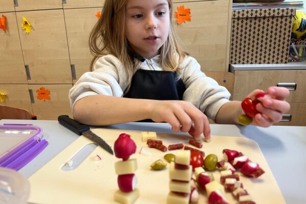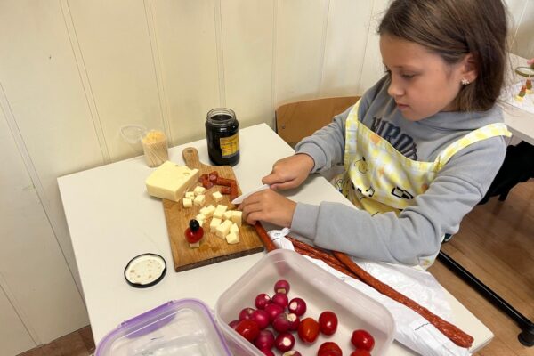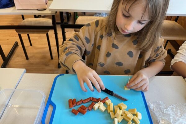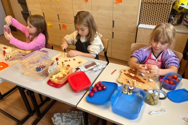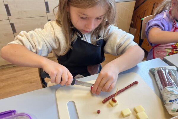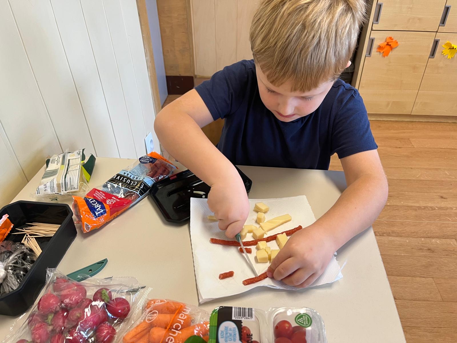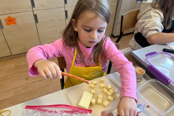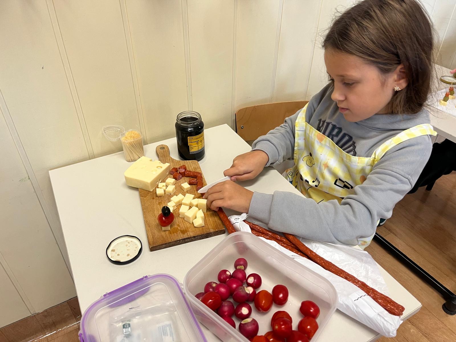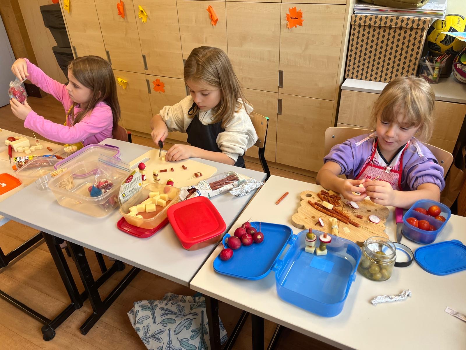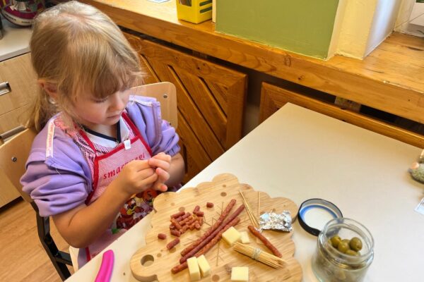 Kolorowe koreczki nie sprawiły nikomu trudności. Dzieci nawlekały kolejno na wykałaczki kosteczki żółtego sera, oliwki, kabanoski, pomidorki i rzodkiewki, jak koraliki na niteczki. Każdy miał swój pomysł, a wszystkie były wyjątkowe i pyszne.