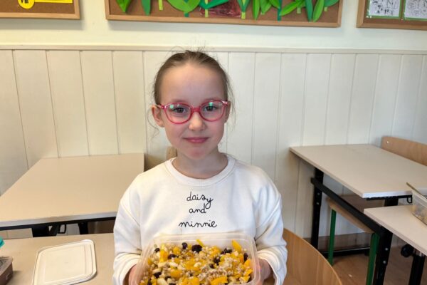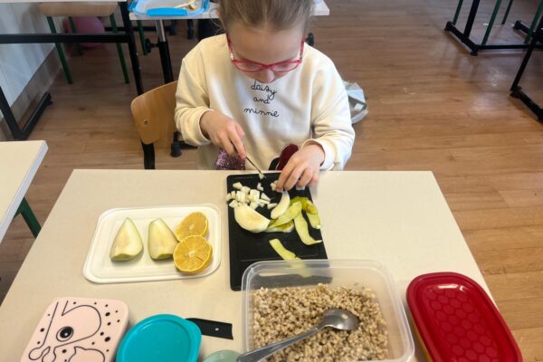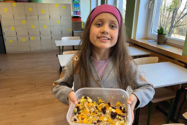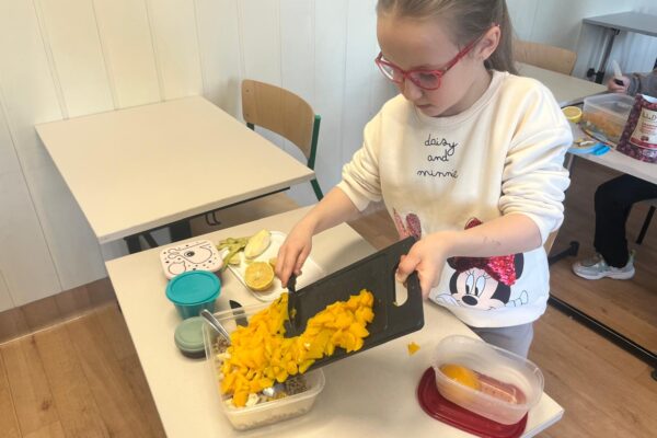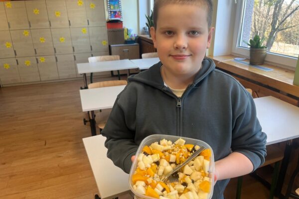Tym razem uczestnicy koła zmierzyli się z trudnym zadaniem. Twarde migdały nie poddawały się, ale i dzieci nie poddały się i posiekały chrupiące smakołyki, które wpadły do miski z pęczkiem razem z żurawiną, rodzynkami i pokrojoną w kosteczkę brzoskwinią. Kolorową sałatkę bakaliową dopełniła słodycz miodu i kwaśny sok z cytryny 🍋