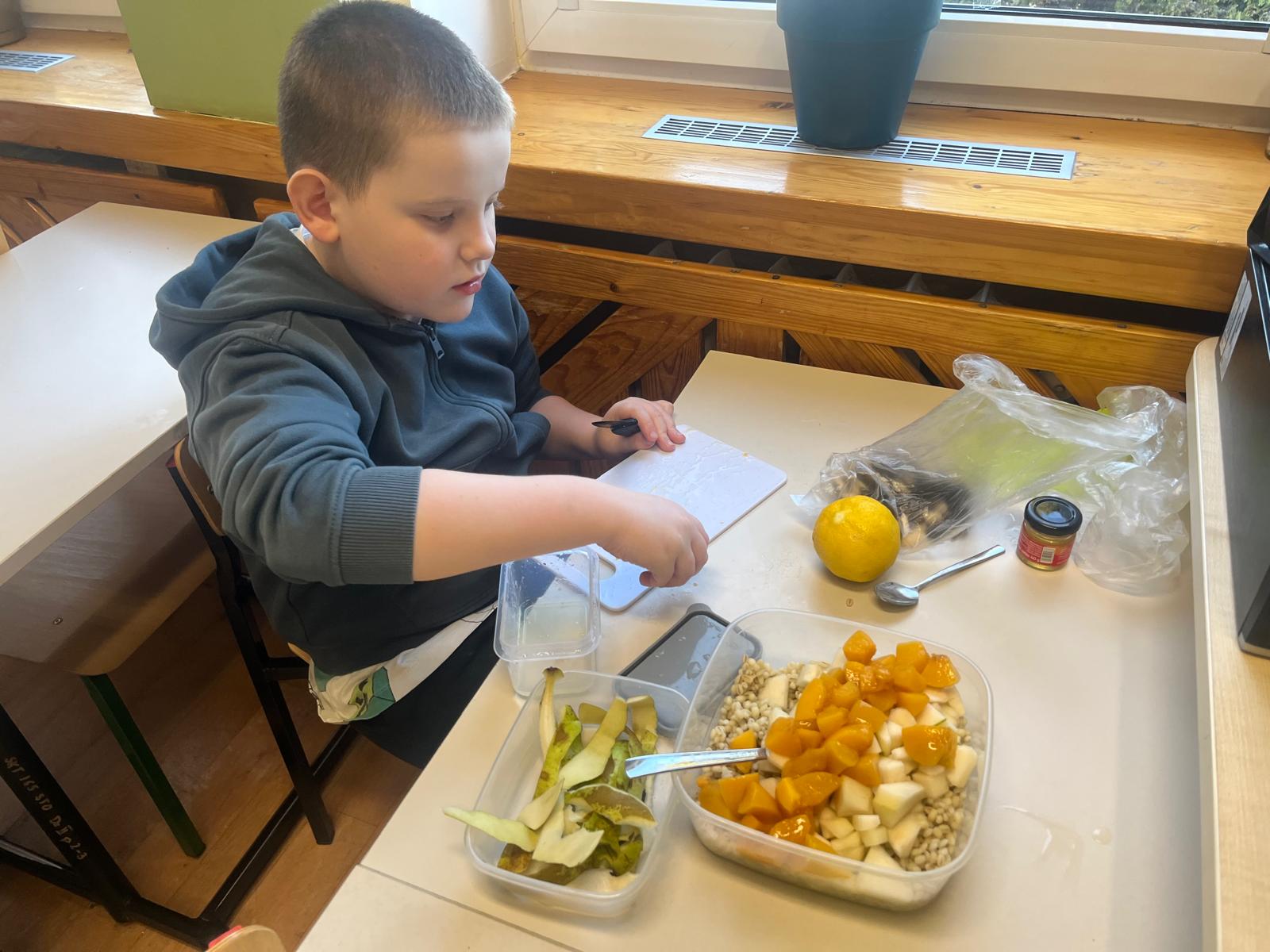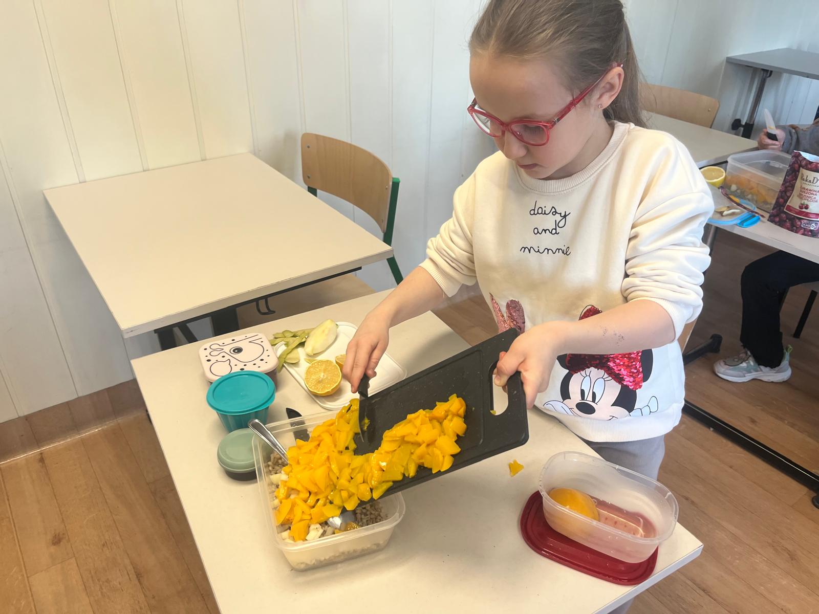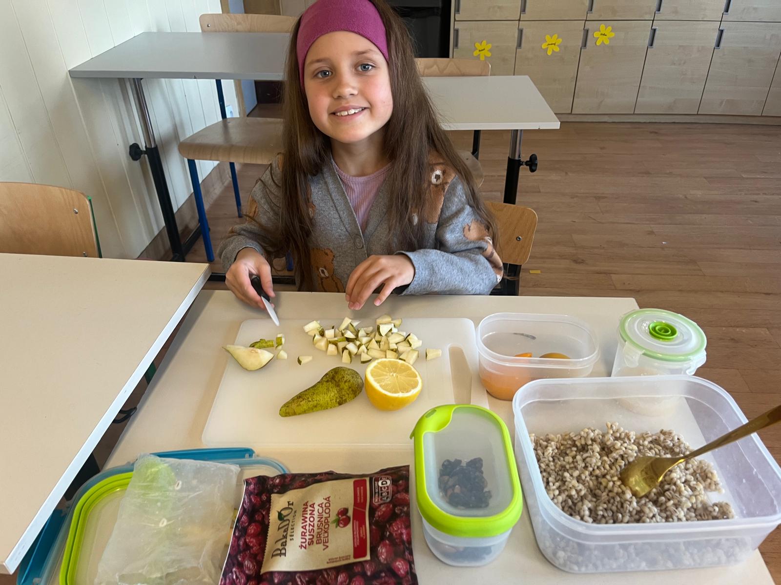 Tym razem uczestnicy koła zmierzyli się z trudnym zadaniem. Twarde migdały nie poddawały się, ale i dzieci nie poddały się i posiekały chrupiące smakołyki, które wpadły do miski z pęczkiem razem z żurawiną, rodzynkami i pokrojoną w kosteczkę brzoskwinią. Kolorową sałatkę bakaliową dopełniła słodycz miodu i kwaśny sok z cytryny 🍋