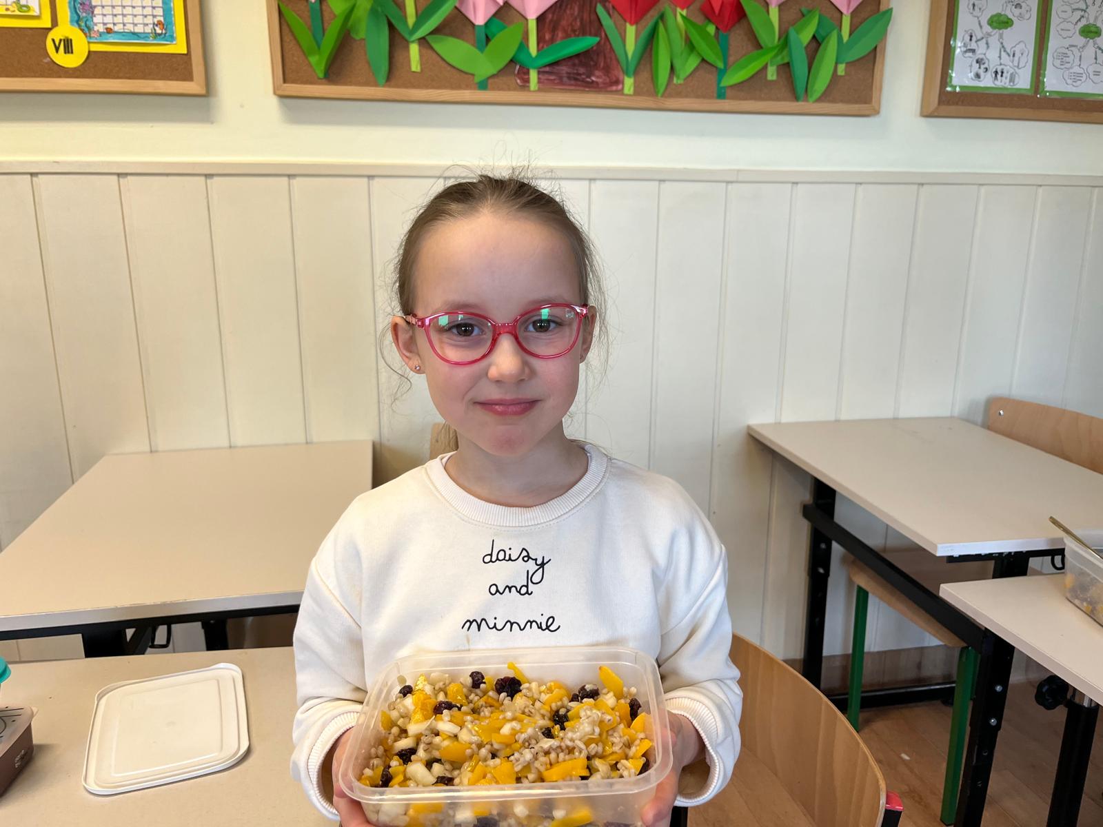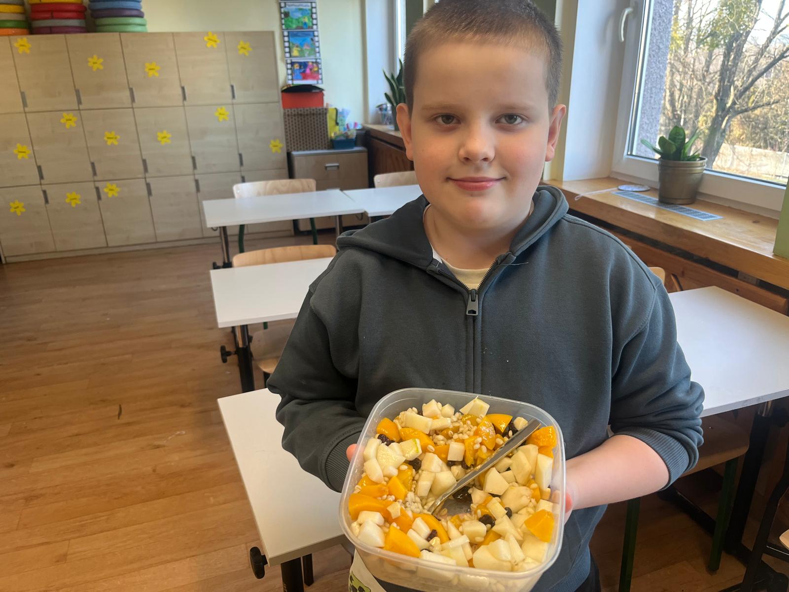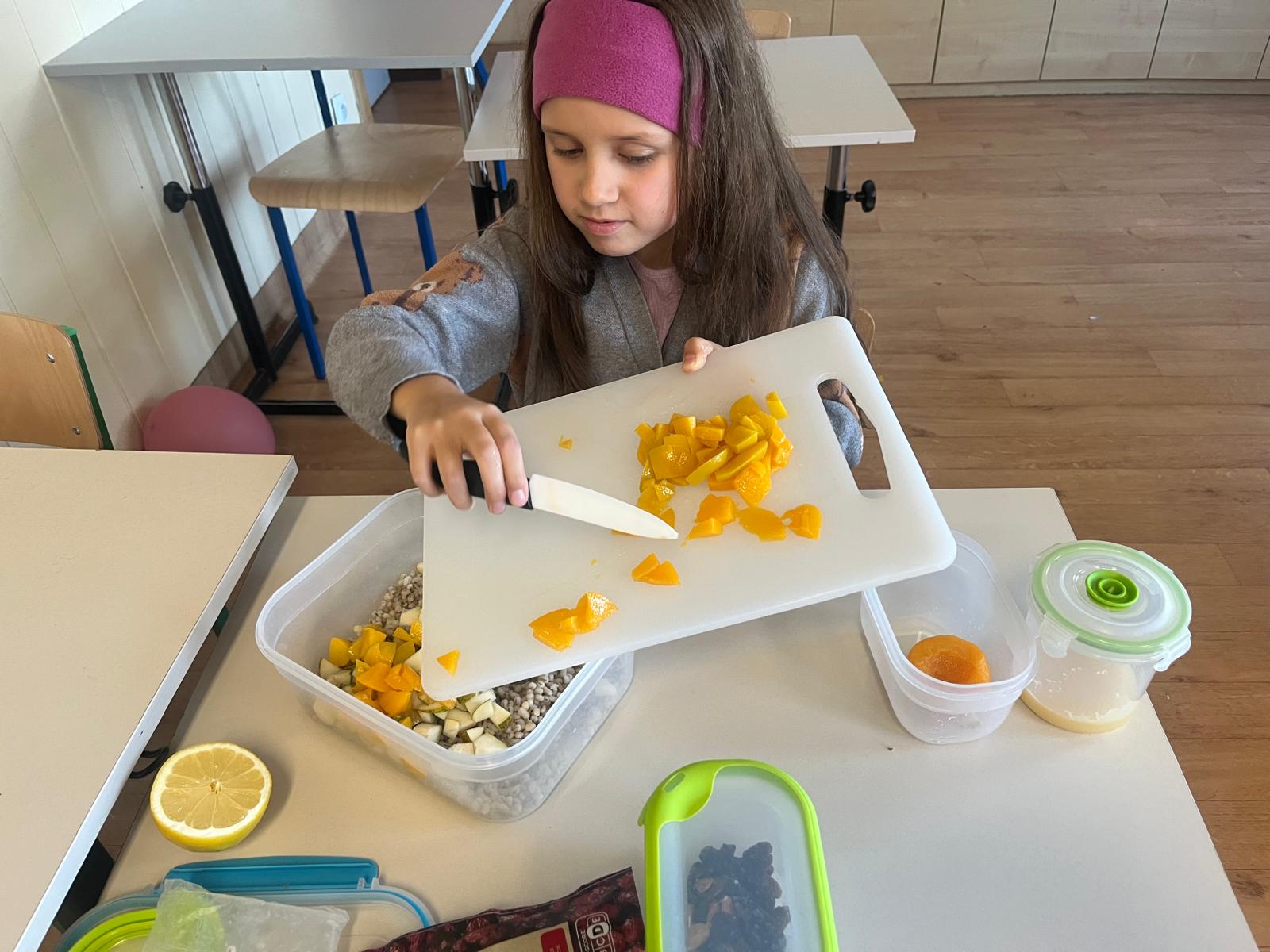 Tym razem uczestnicy koła zmierzyli się z trudnym zadaniem. Twarde migdały nie poddawały się, ale i dzieci nie poddały się i posiekały chrupiące smakołyki, które wpadły do miski z pęczkiem razem z żurawiną, rodzynkami i pokrojoną w kosteczkę brzoskwinią. Kolorową sałatkę bakaliową dopełniła słodycz miodu i kwaśny sok z cytryny 🍋