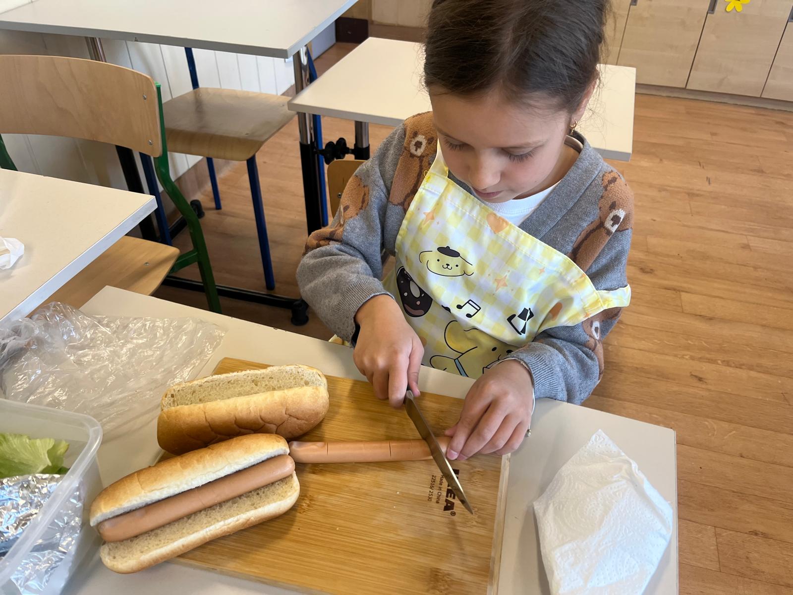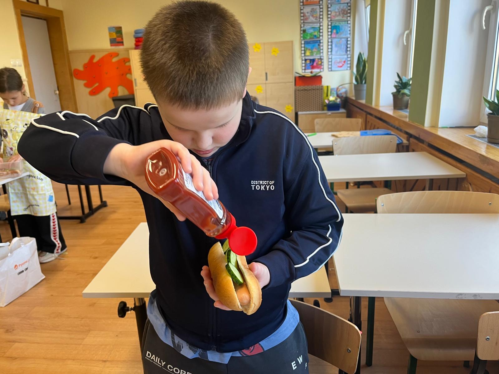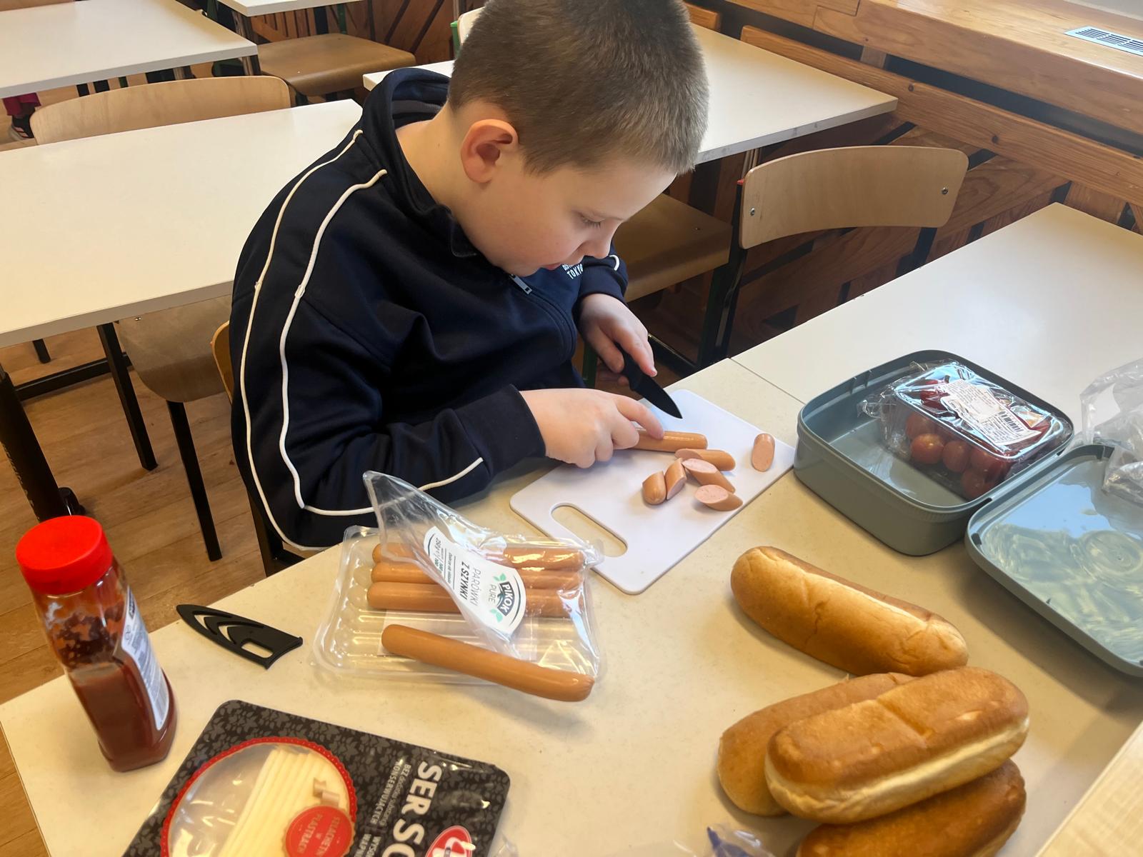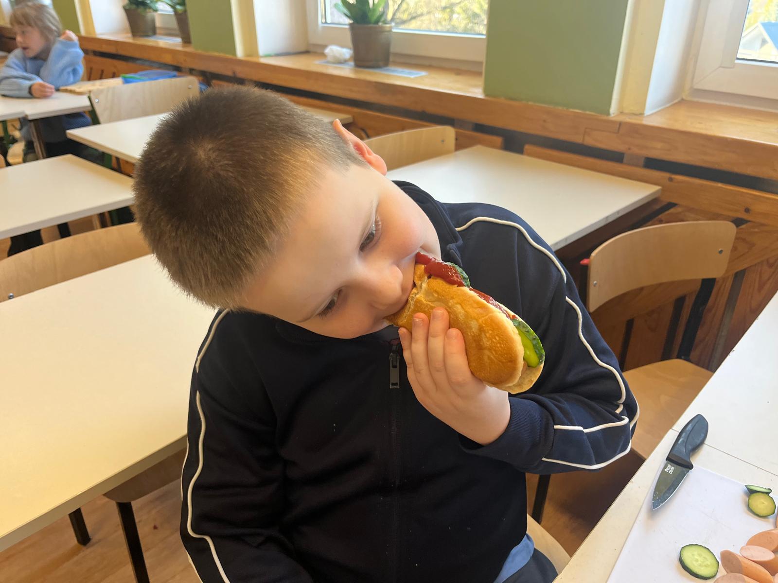 Hod dogi we własnym wykonaniu z ulubionymi dodatkami były smaczną propozycją na popołudnie w szkole. Uczestnicy z uśmiechem i ze smakiem skonsumowali swoje pyszności, które przygotowali z wykorzystaniem sprzętu zakupionego z programu Laboratoria Przyszłości.