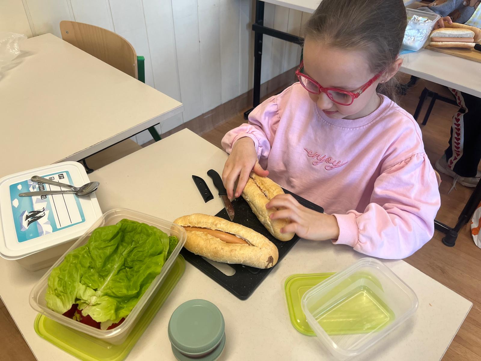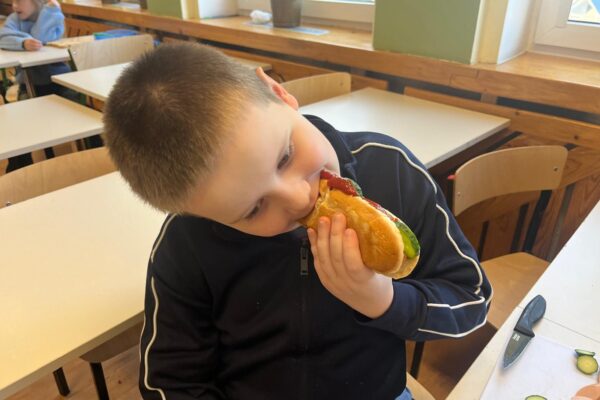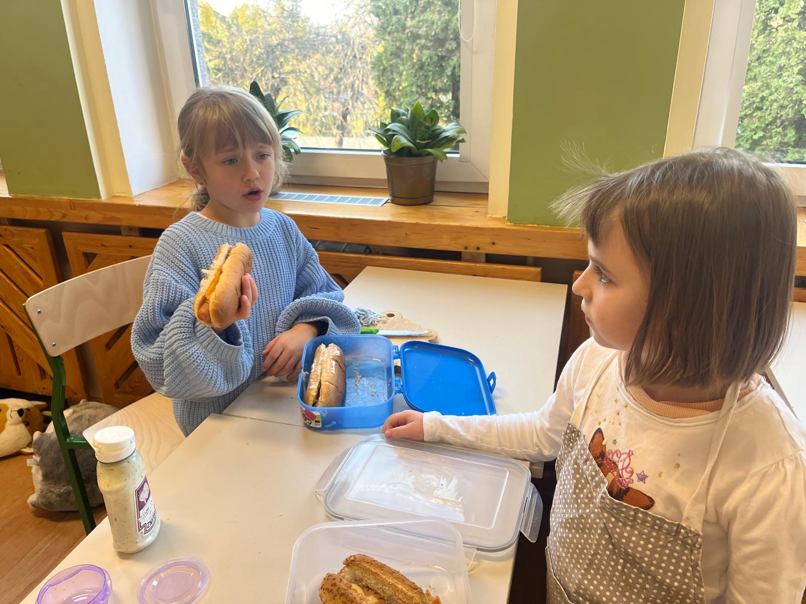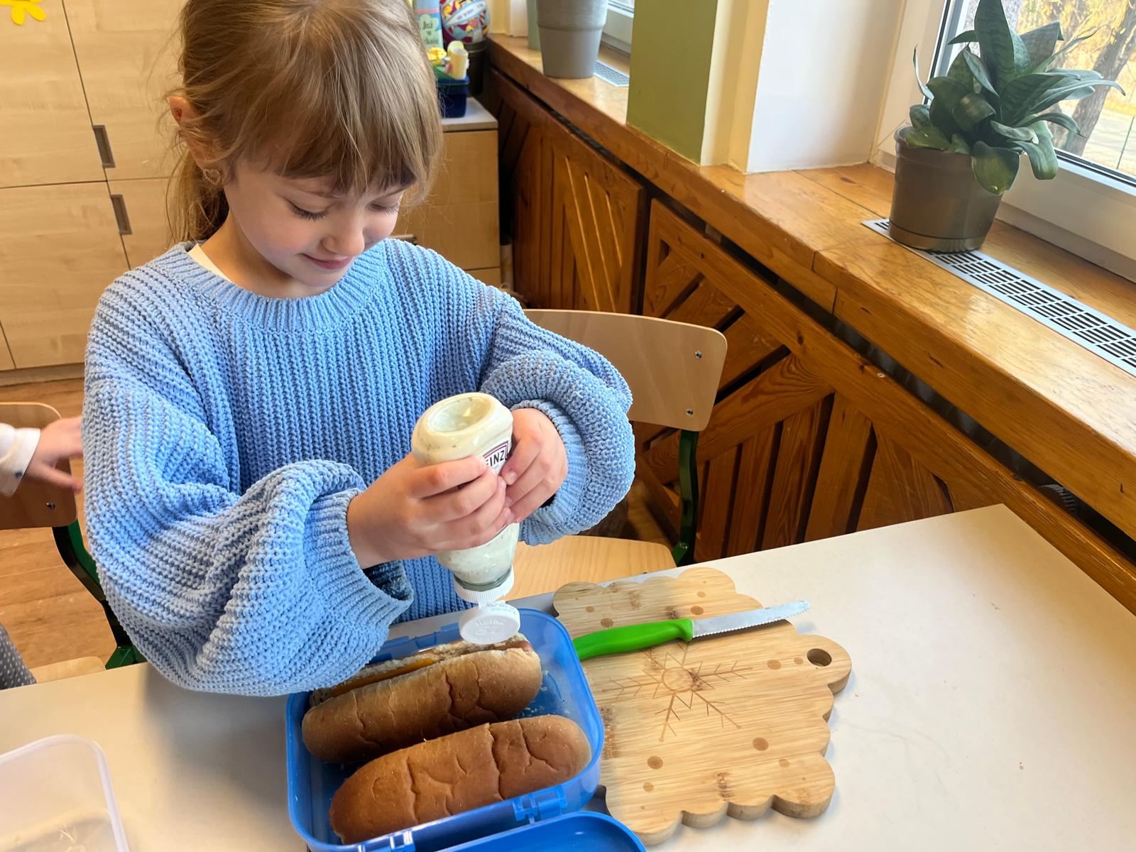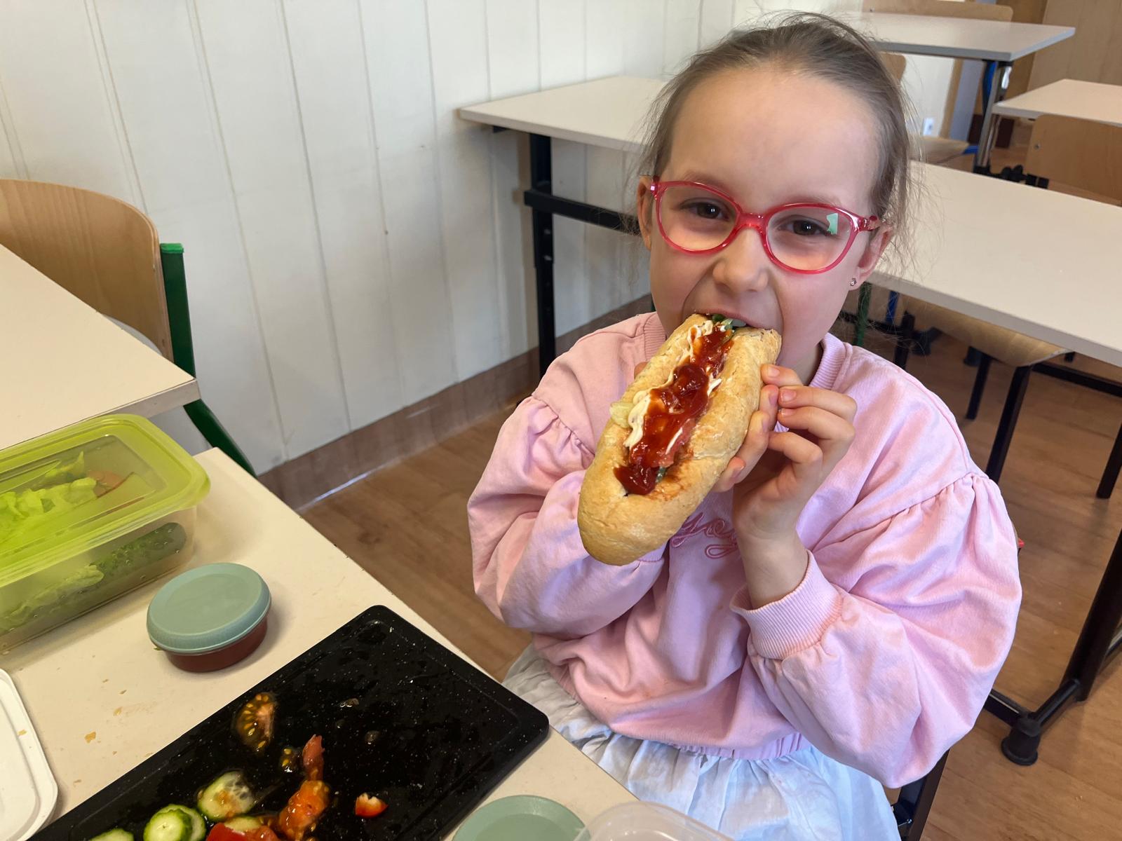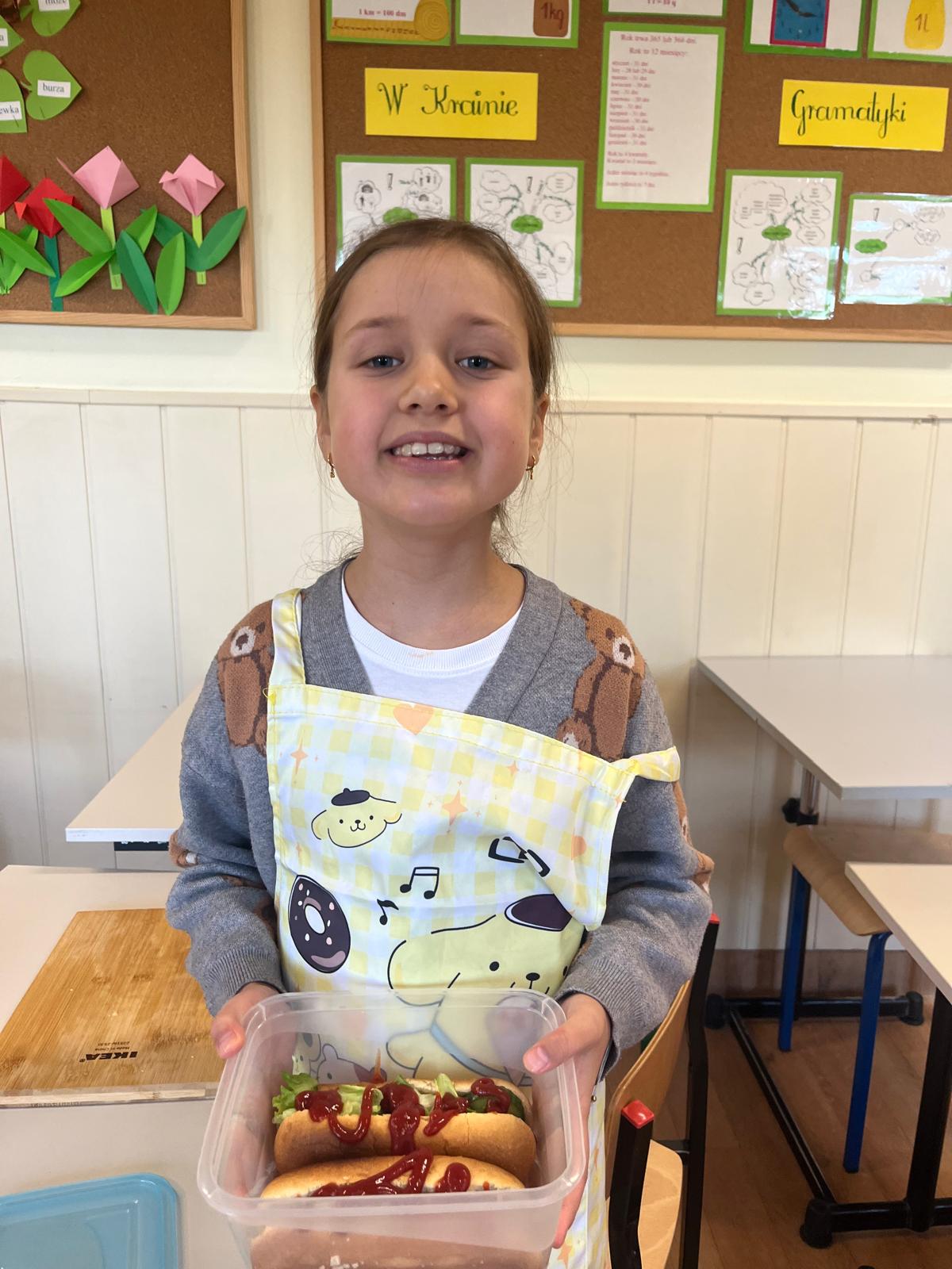 Hod dogi we własnym wykonaniu z ulubionymi dodatkami były smaczną propozycją na popołudnie w szkole. Uczestnicy z uśmiechem i ze smakiem skonsumowali swoje pyszności, które przygotowali z wykorzystaniem sprzętu zakupionego z programu Laboratoria Przyszłości.
