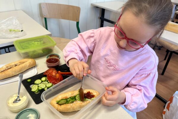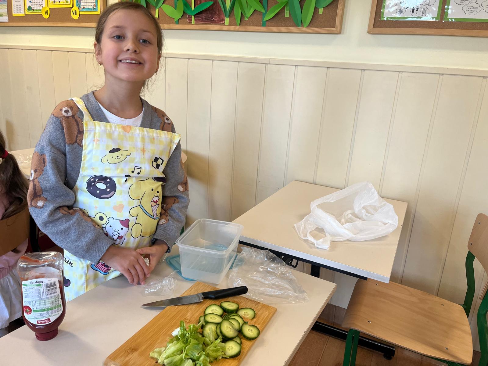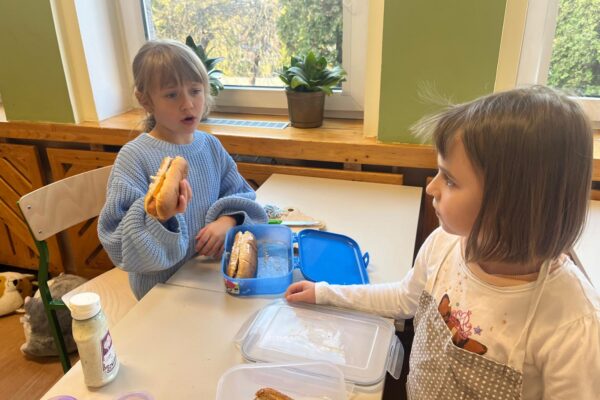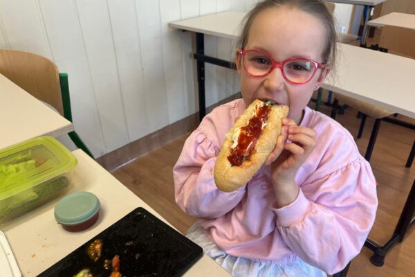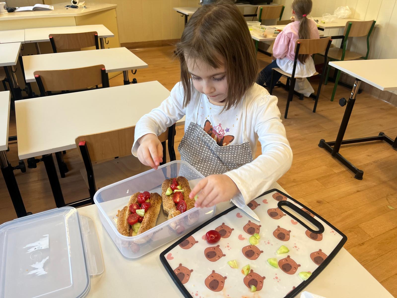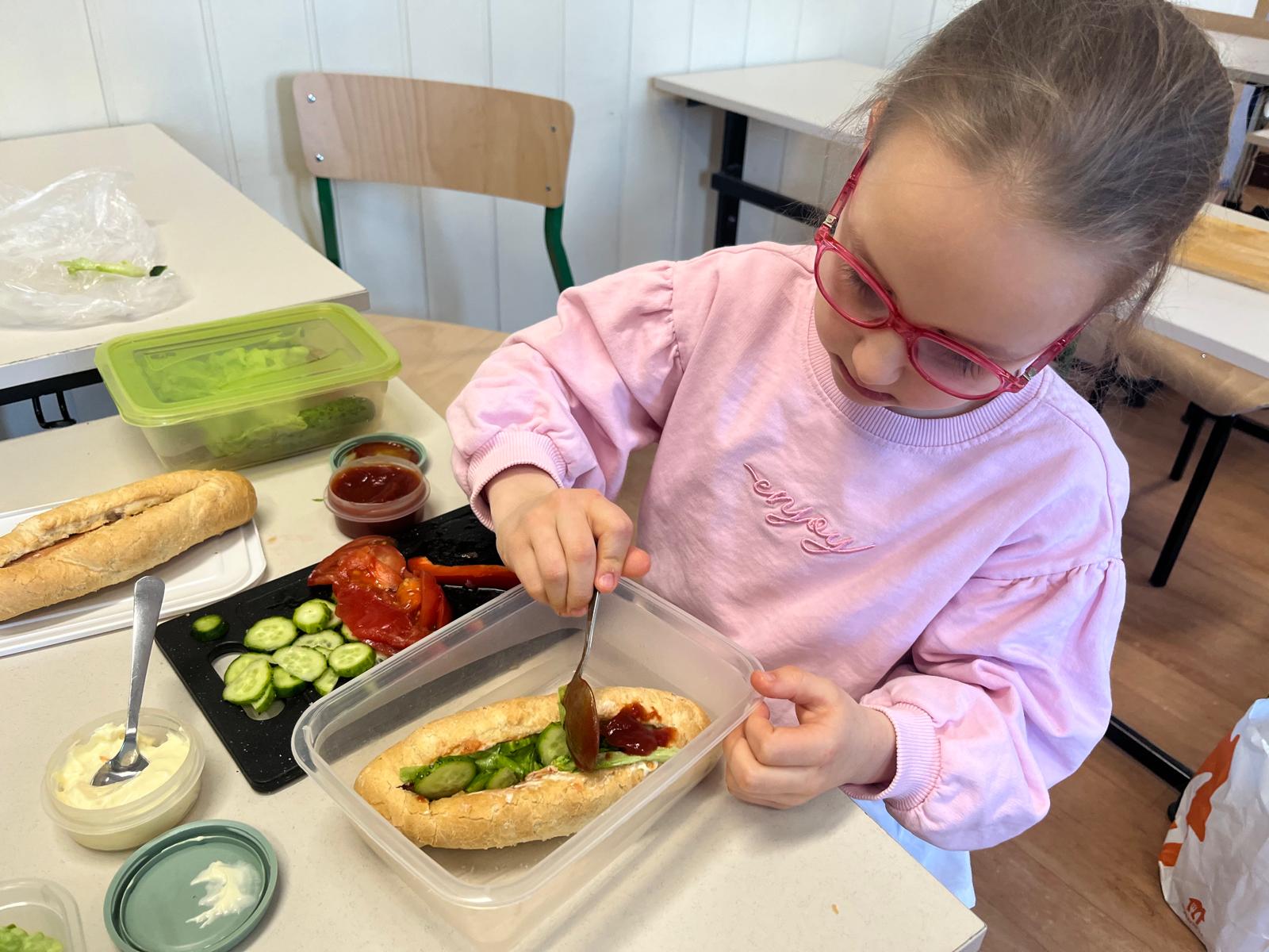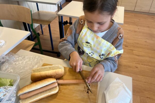 Hod dogi we własnym wykonaniu z ulubionymi dodatkami były smaczną propozycją na popołudnie w szkole. Uczestnicy z uśmiechem i ze smakiem skonsumowali swoje pyszności, które przygotowali z wykorzystaniem sprzętu zakupionego z programu Laboratoria Przyszłości.
