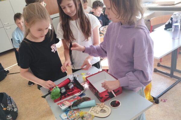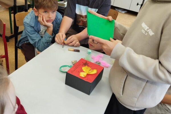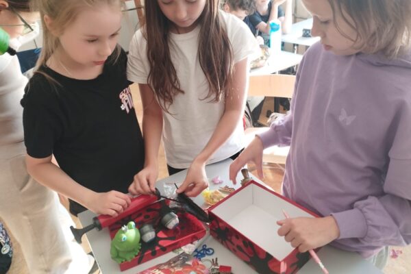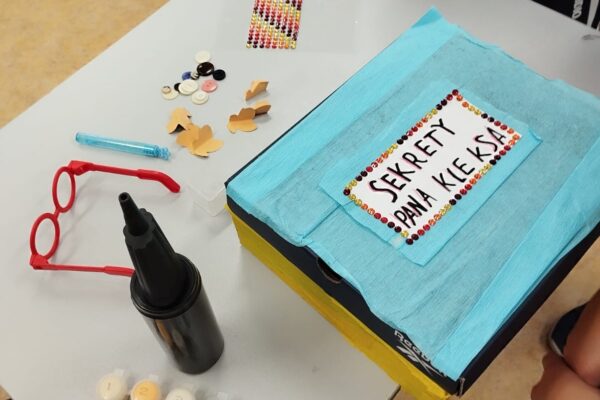 Klasa 4a realizowała w październiku klasowy projekt ,,Lektura w pudełku ” , który ma na celu rozbudzenie zainteresowania lekturami szkolnymi, ułatwienie zapamiętywania treści lektury oraz rozwijanie kreatywności uczniów. Po przeczytaniu książki Jana Brzechwy, każdy z uczniów przygotowal swoje bajkowe pudełko, do którego włożył rekwizyty kojarzące się z przeczytaną lektura oraz list do Pana Kleksa, w którym opisał swoją szkołę. Wśród niecodziennych zbiorów znalazły się m. in. pompka powiekszajaca, magiczne lusterka, kolorowe piegi profesora Kleksa, zielony płyn przywracający pamięć , pigułki na porost włosów, guzik oderwany od czapki bogdychanow, klucze do furtek różnych bajek i wiele innych. Dzieci prezentowały zgromadzone przez siebie skarby na forum klasy, opowiadając jednocześnie o niezwykłych umiejętnościach Ambrożego Kleksa oraz przygodach Adama Niezgodki i jego kolegów z Akademii. Zadanie wymagalo od uczniów pomysłowości i dobrej znajomości lektury, a jednocześnie stało się atrakcyjną formą pracy z utworem literackim.