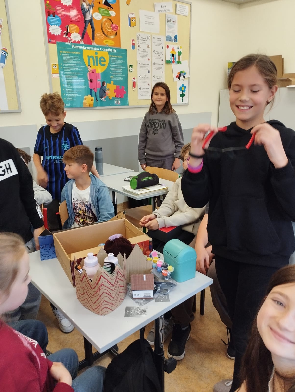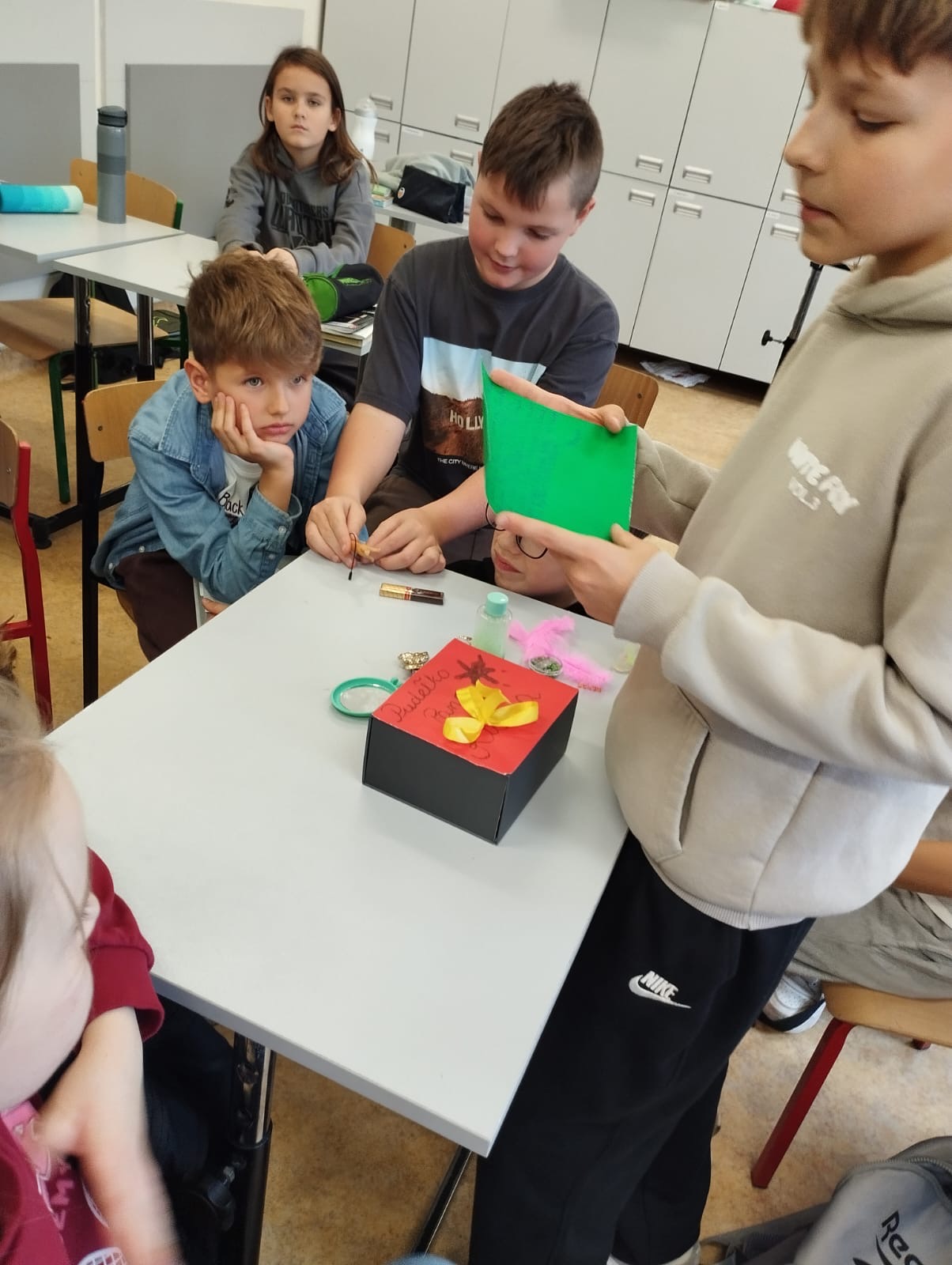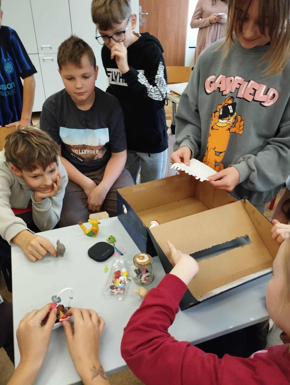 Klasa 4a realizowała w październiku klasowy projekt ,,Lektura w pudełku ” , który ma na celu rozbudzenie zainteresowania lekturami szkolnymi, ułatwienie zapamiętywania treści lektury oraz rozwijanie kreatywności uczniów. Po przeczytaniu książki Jana Brzechwy, każdy z uczniów przygotowal swoje bajkowe pudełko, do którego włożył rekwizyty kojarzące się z przeczytaną lektura oraz list do Pana Kleksa, w którym opisał swoją szkołę. Wśród niecodziennych zbiorów znalazły się m. in. pompka powiekszajaca, magiczne lusterka, kolorowe piegi profesora Kleksa, zielony płyn przywracający pamięć , pigułki na porost włosów, guzik oderwany od czapki bogdychanow, klucze do furtek różnych bajek i wiele innych. Dzieci prezentowały zgromadzone przez siebie skarby na forum klasy, opowiadając jednocześnie o niezwykłych umiejętnościach Ambrożego Kleksa oraz przygodach Adama Niezgodki i jego kolegów z Akademii. Zadanie wymagalo od uczniów pomysłowości i dobrej znajomości lektury, a jednocześnie stało się atrakcyjną formą pracy z utworem literackim.