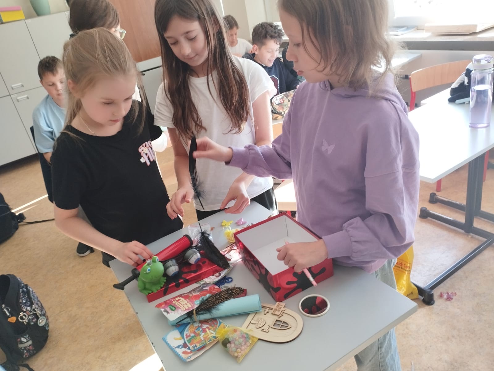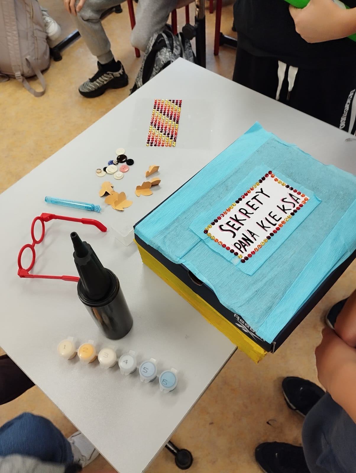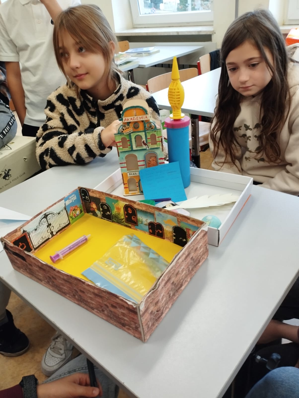 Klasa 4a realizowała w październiku klasowy projekt ,,Lektura w pudełku ” , który ma na celu rozbudzenie zainteresowania lekturami szkolnymi, ułatwienie zapamiętywania treści lektury oraz rozwijanie kreatywności uczniów. Po przeczytaniu książki Jana Brzechwy, każdy z uczniów przygotowal swoje bajkowe pudełko, do którego włożył rekwizyty kojarzące się z przeczytaną lektura oraz list do Pana Kleksa, w którym opisał swoją szkołę. Wśród niecodziennych zbiorów znalazły się m. in. pompka powiekszajaca, magiczne lusterka, kolorowe piegi profesora Kleksa, zielony płyn przywracający pamięć , pigułki na porost włosów, guzik oderwany od czapki bogdychanow, klucze do furtek różnych bajek i wiele innych. Dzieci prezentowały zgromadzone przez siebie skarby na forum klasy, opowiadając jednocześnie o niezwykłych umiejętnościach Ambrożego Kleksa oraz przygodach Adama Niezgodki i jego kolegów z Akademii. Zadanie wymagalo od uczniów pomysłowości i dobrej znajomości lektury, a jednocześnie stało się atrakcyjną formą pracy z utworem literackim.