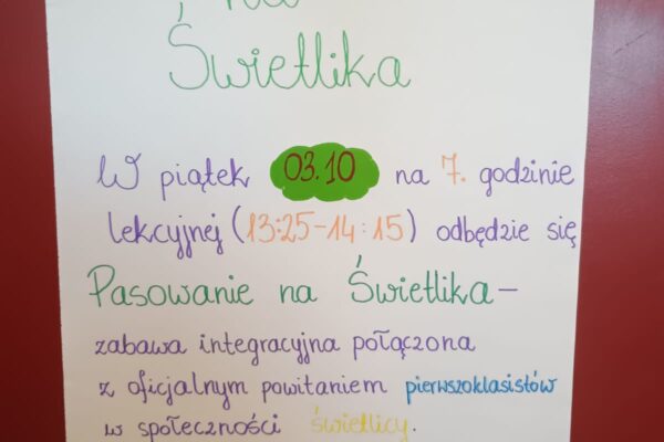 W piątek 03.10 na 7. godzinie lekcyjnej (13:25-14:15) odbędzie się Pasowanie na Świetlika – zabawa integracyjna połączona z oficjalnym powitaniem pierwszoklasistów w społeczności świetlicy. Nauczyciele świetlicy