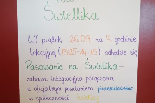 W piątek 26.09 na 7. godzinie lekcyjnej (13:25-14:15) odbędzie się Pasowanie na Świetlika – zabawa integracyjna połączona z oficjalnym powitaniem pierwszoklasistów w społeczności świetlicy. Nauczyciele świetlicy