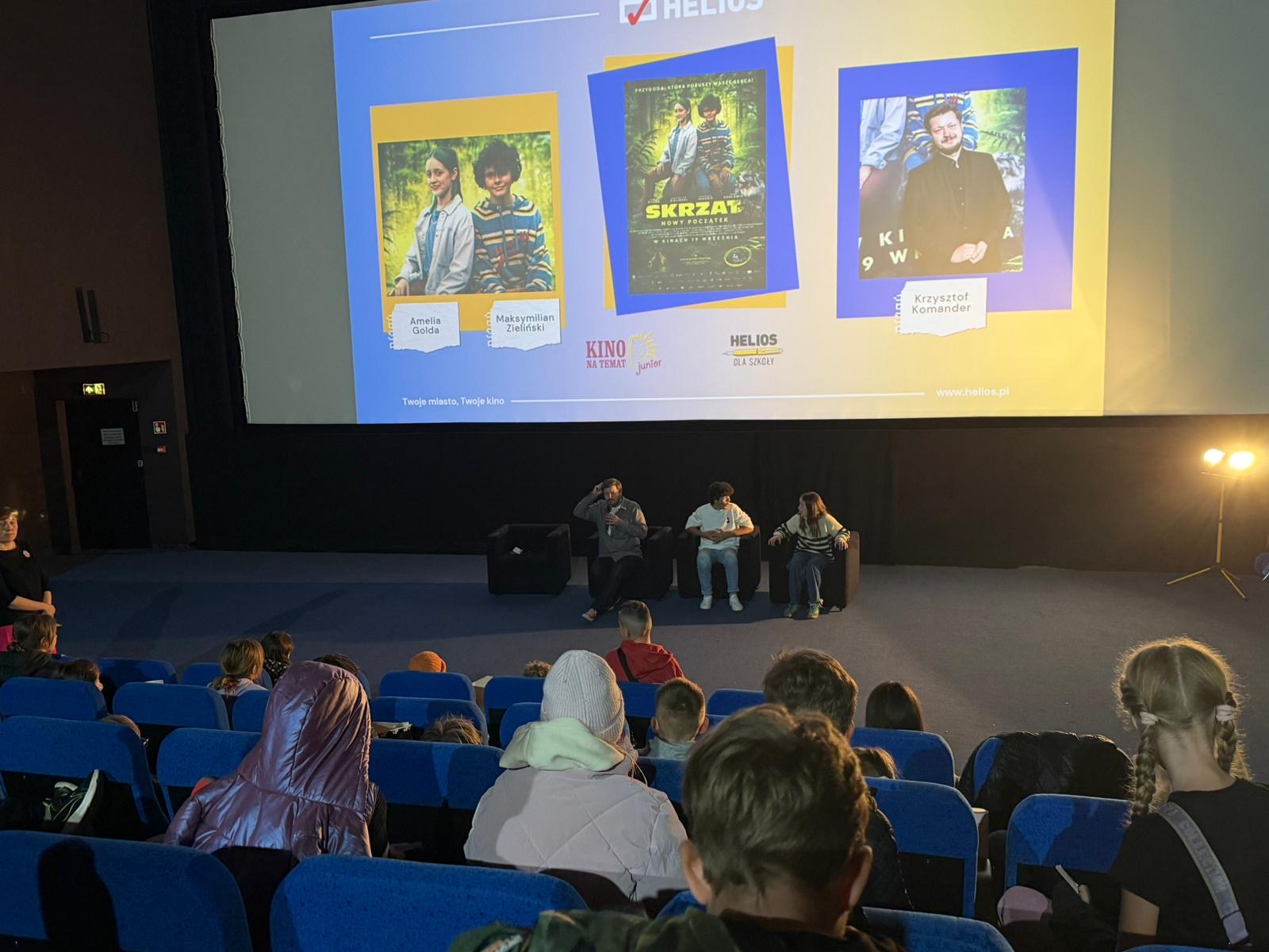 Klasy 4a, 4b oraz 5a w miniony czwartek odwiedziły kino i obejrzały film „Skrzat. Nowy początek” poruszający tematykę hejtu i nękania w grupie rówieśniczej. Projekcja poprzedzona była krótkim wstępem pedagogów zajmujących się tym tematem, a po zakończeniu oglądania widzowie mieli okazję zadać pytania twórcom filmu w czasie spotkania z reżyserem Krzysztofem Komanderem oraz odtwórcami głównych ról – Hani, w której postać wcieliła się Amelia Golda oraz Michała zagranego przez Maksymiliana Zielińskiego.