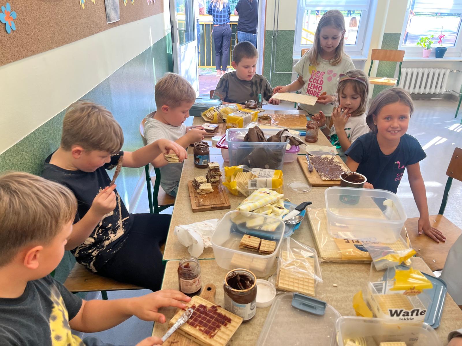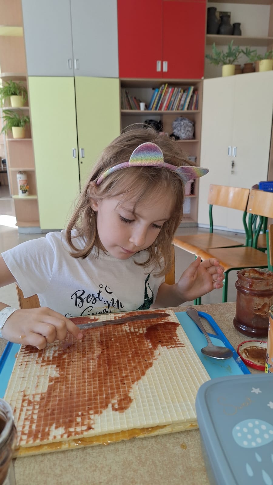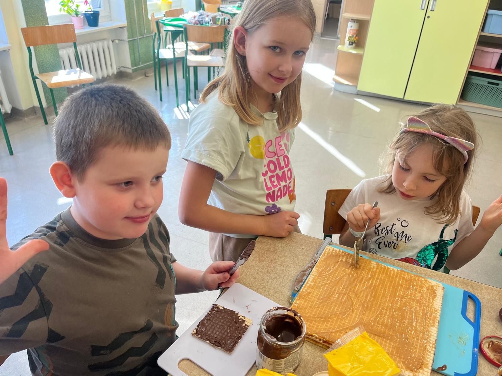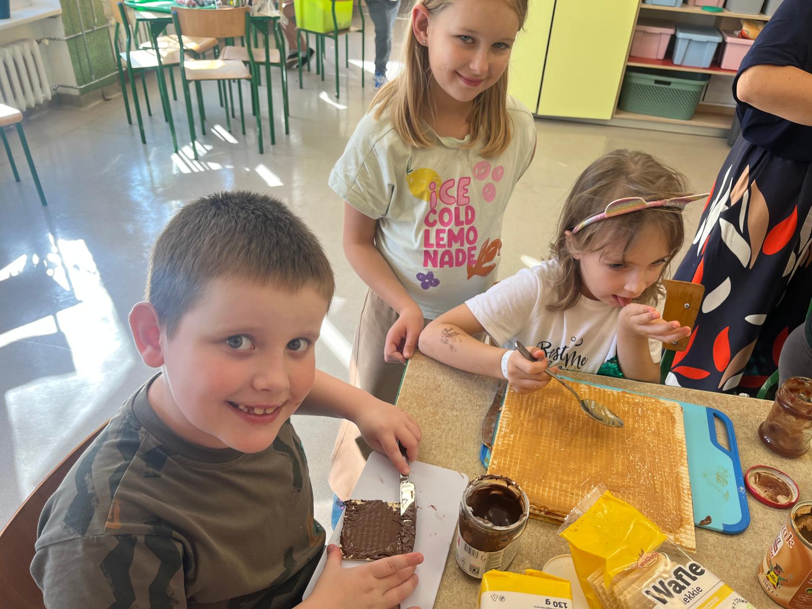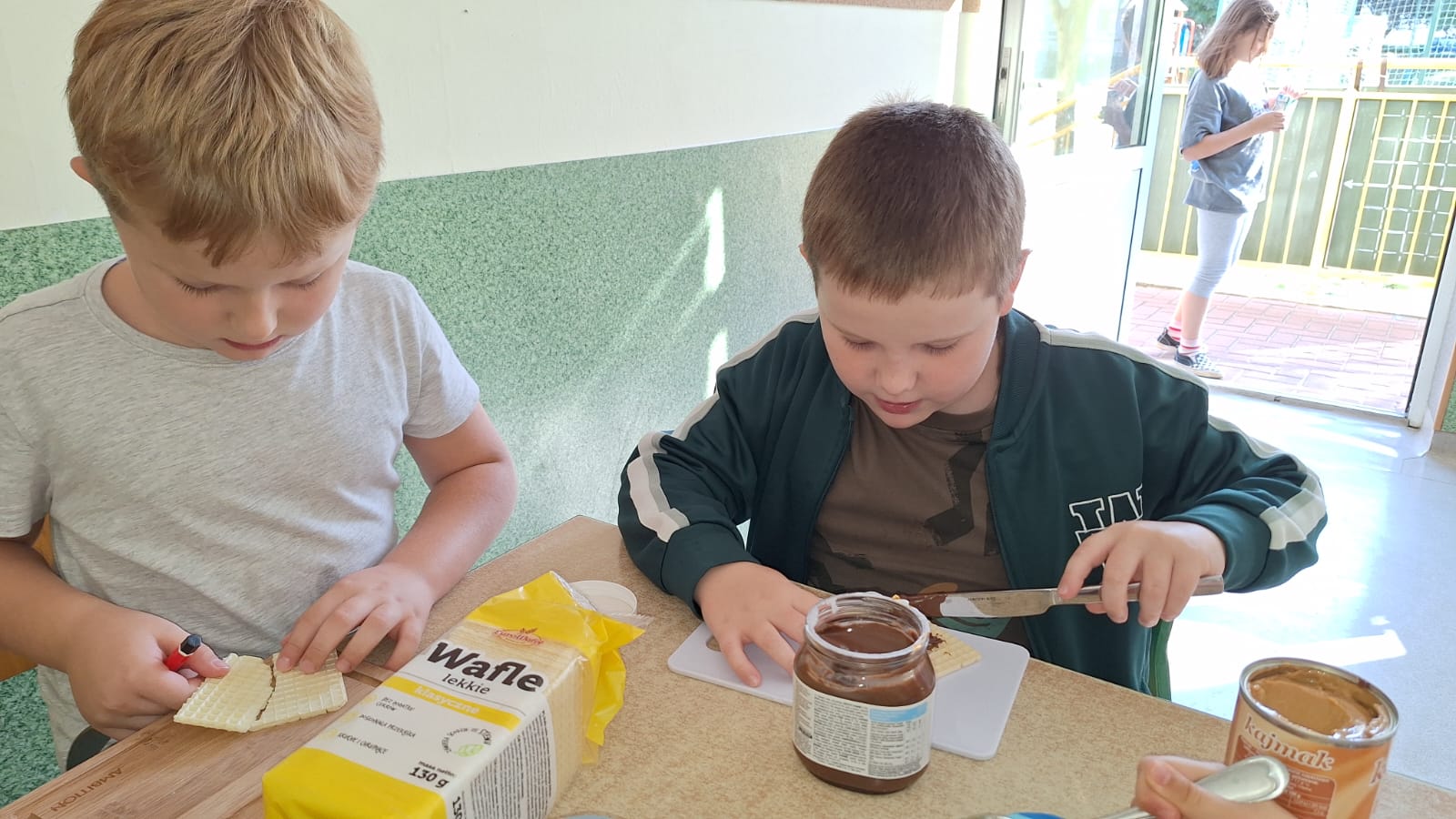 Na zajęciach kulinarnych w ruch poszły wafle małe i wafle duże. Nożyki sprawnie smarowały, a dzieci paluszki oblizywały. Potem równiutko pokroiły i w pudełeczkach umieściły, a w domu rodzinkę ugościły.