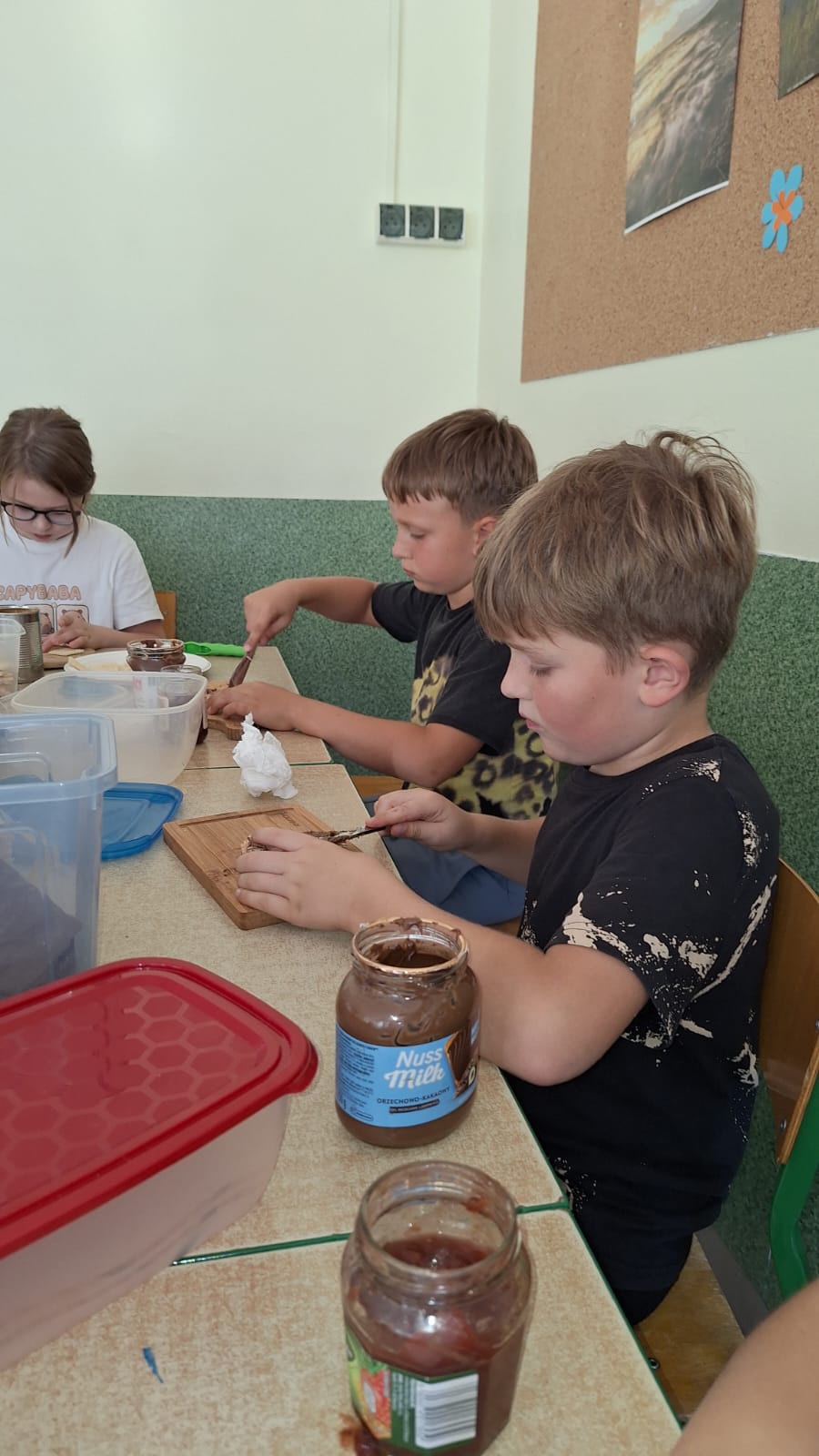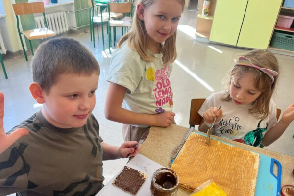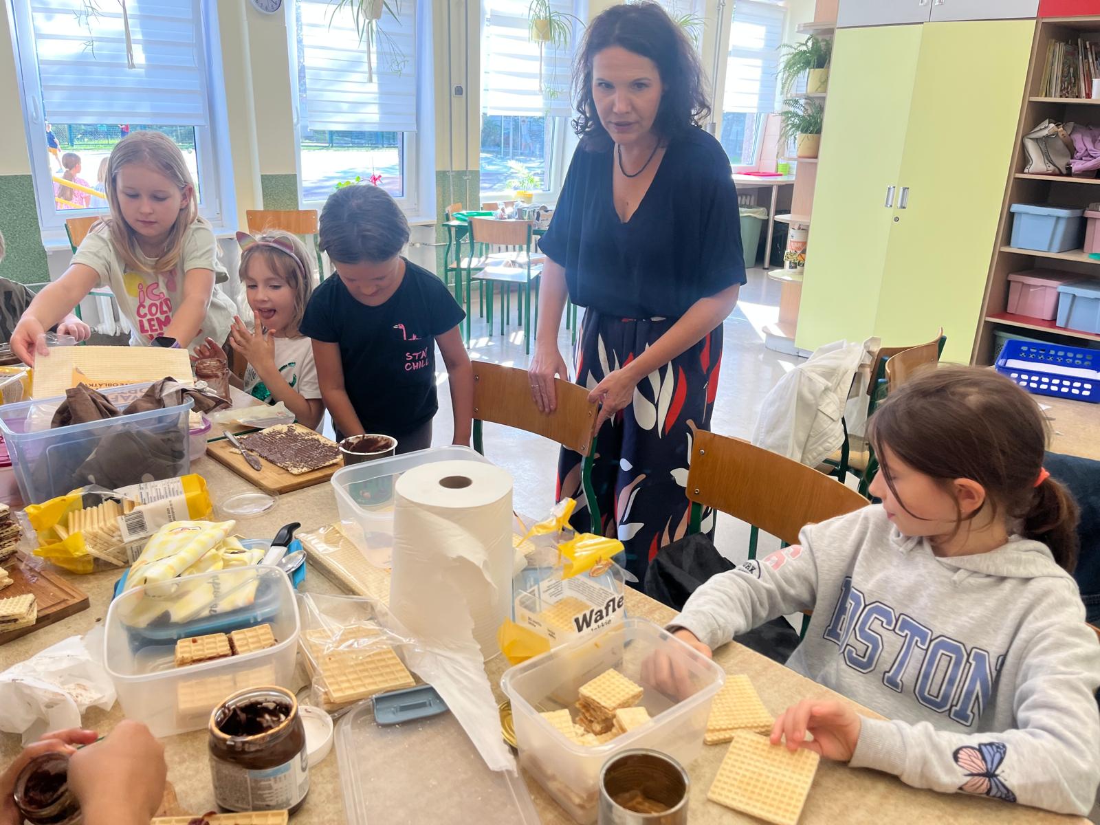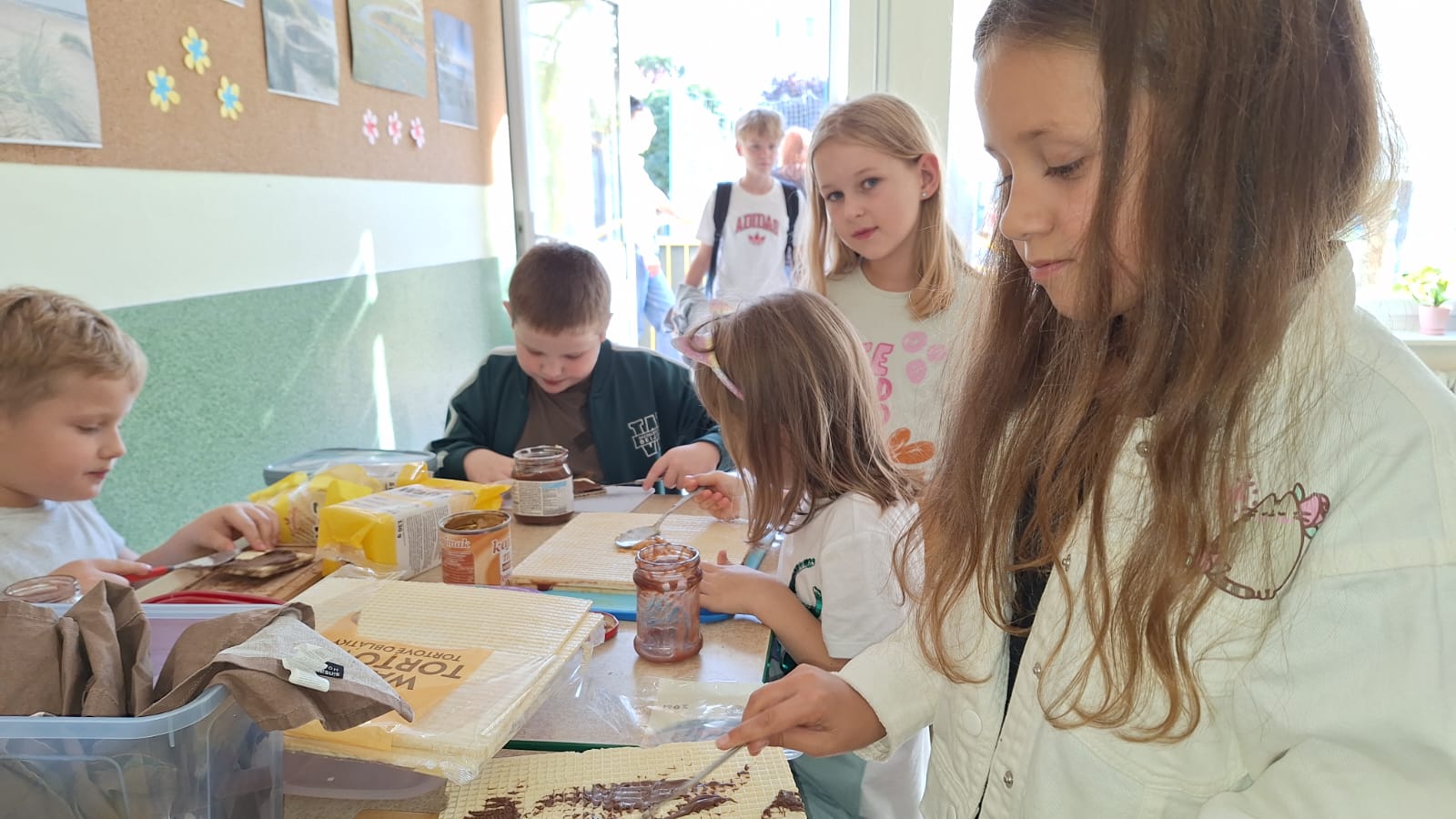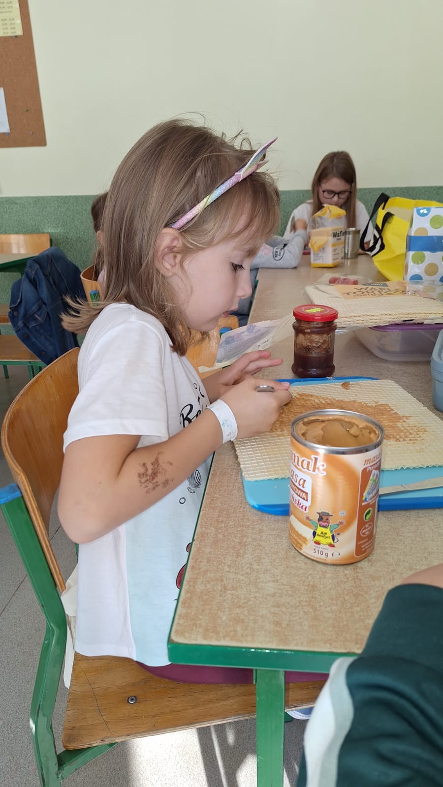 Na zajęciach kulinarnych w ruch poszły wafle małe i wafle duże. Nożyki sprawnie smarowały, a dzieci paluszki oblizywały. Potem równiutko pokroiły i w pudełeczkach umieściły, a w domu rodzinkę ugościły.