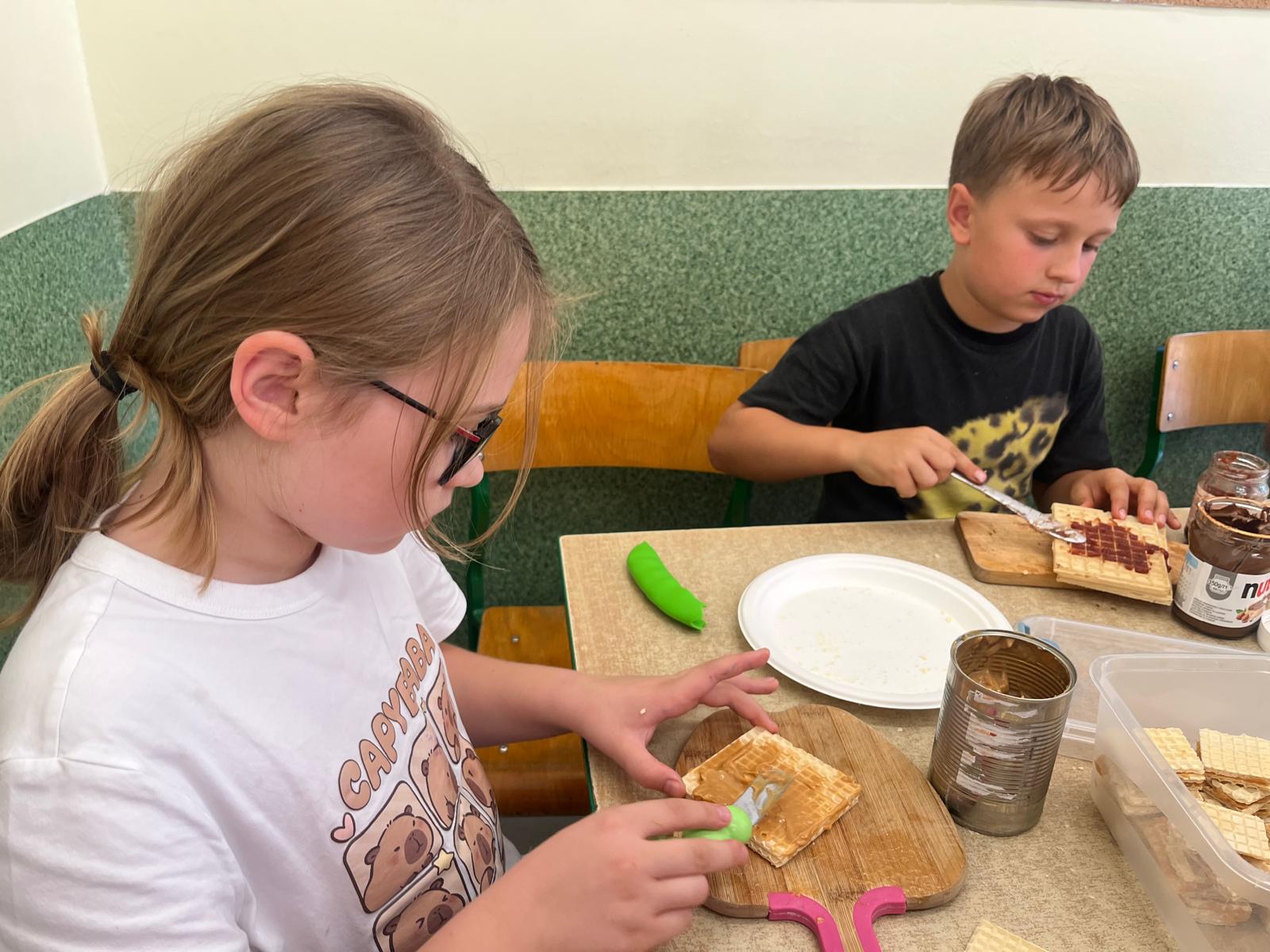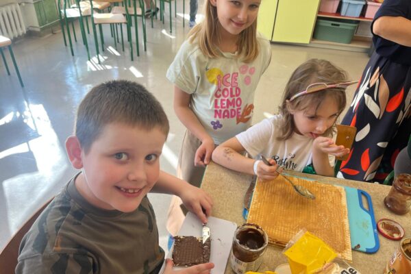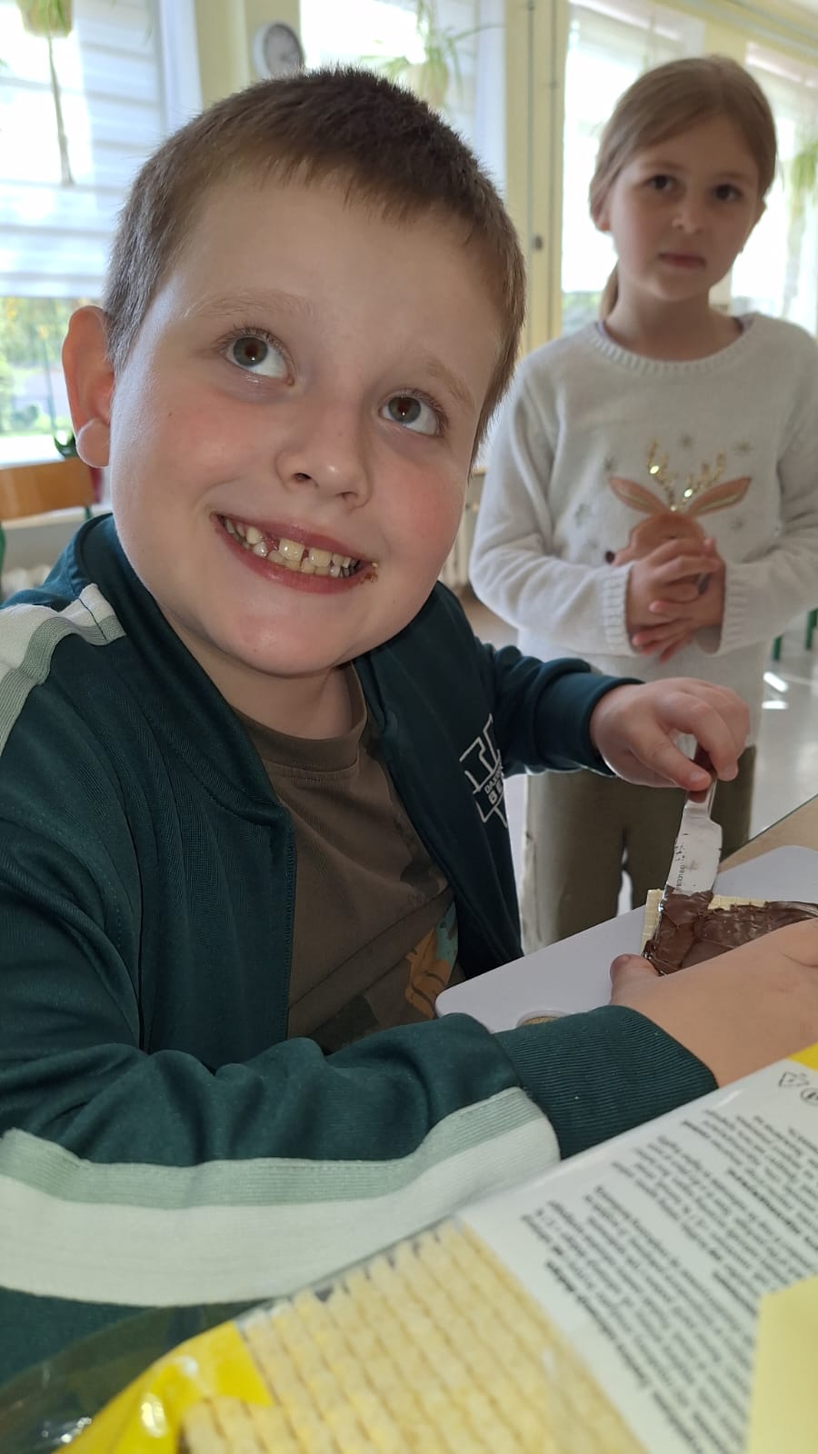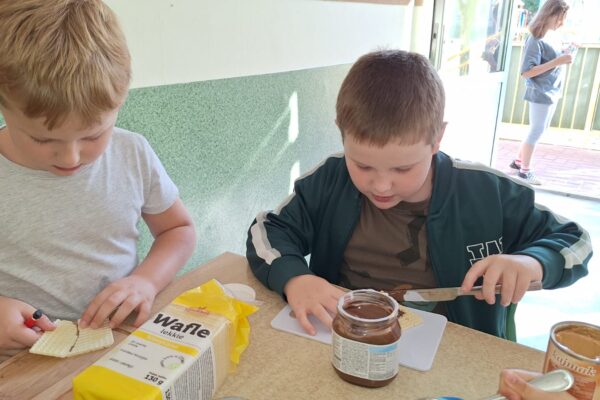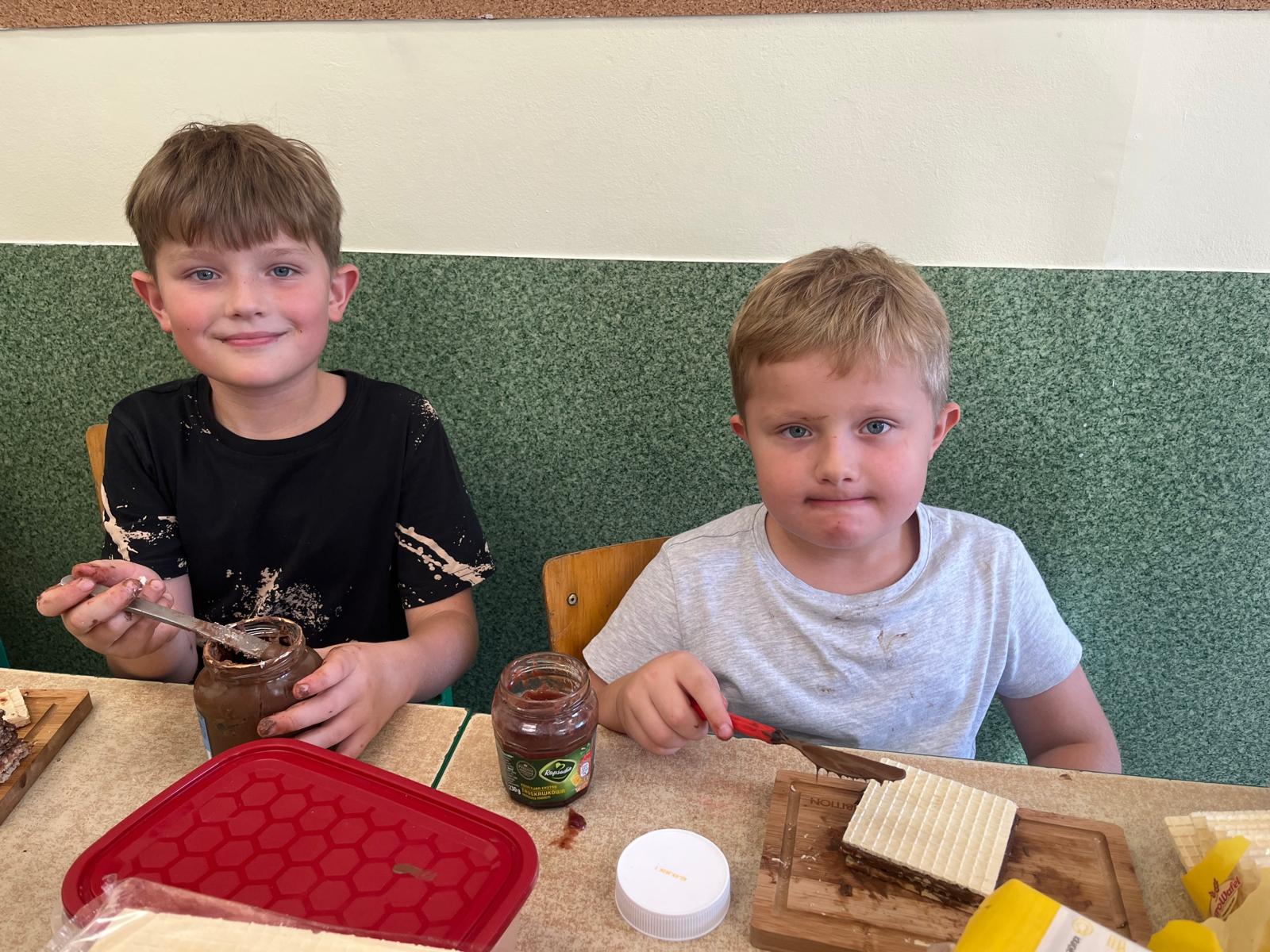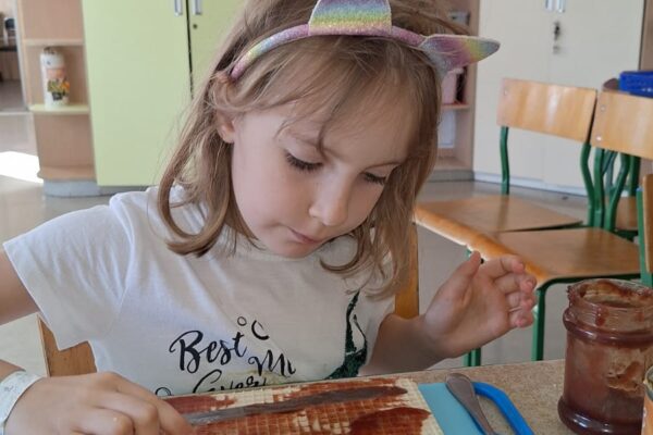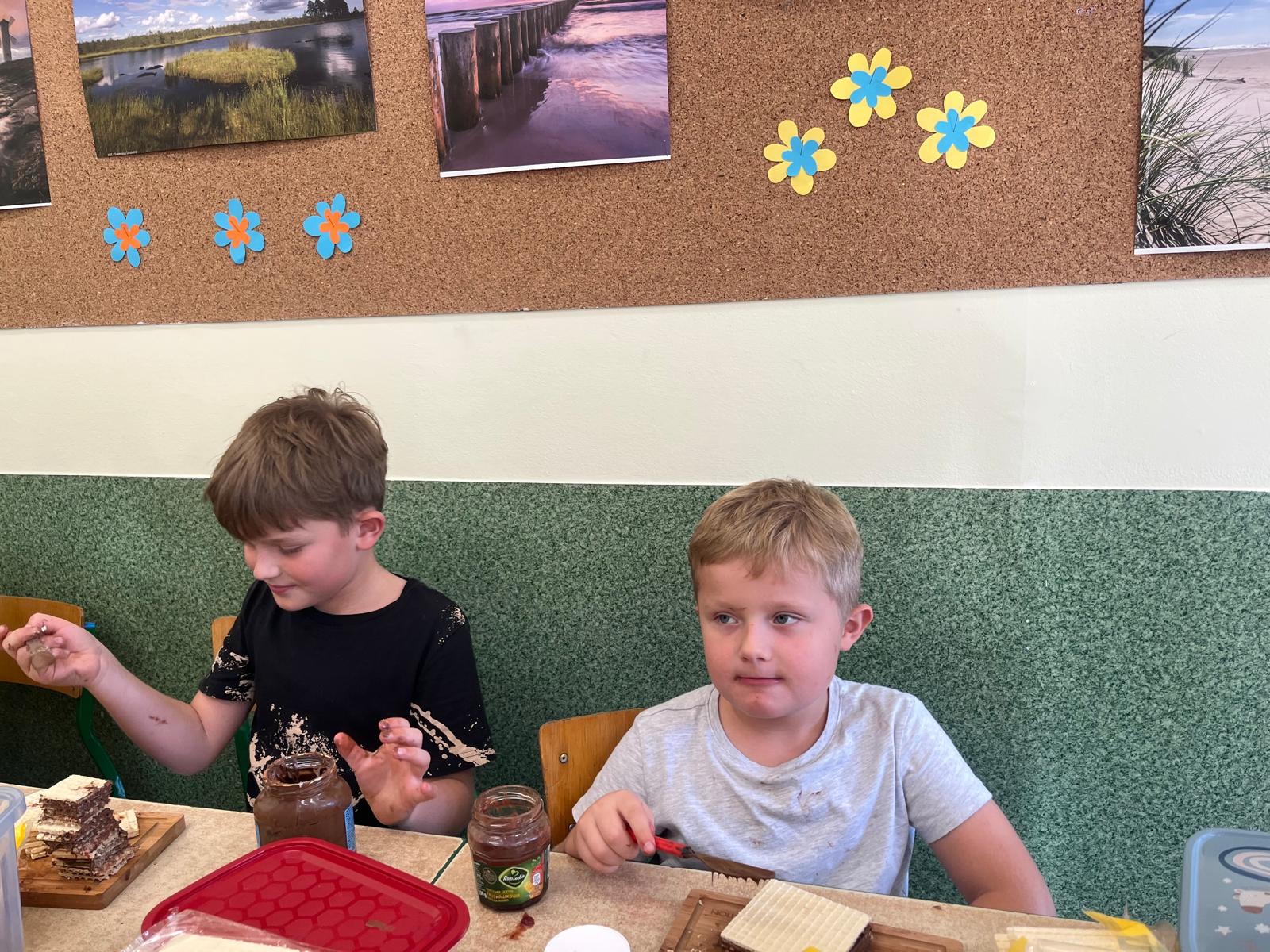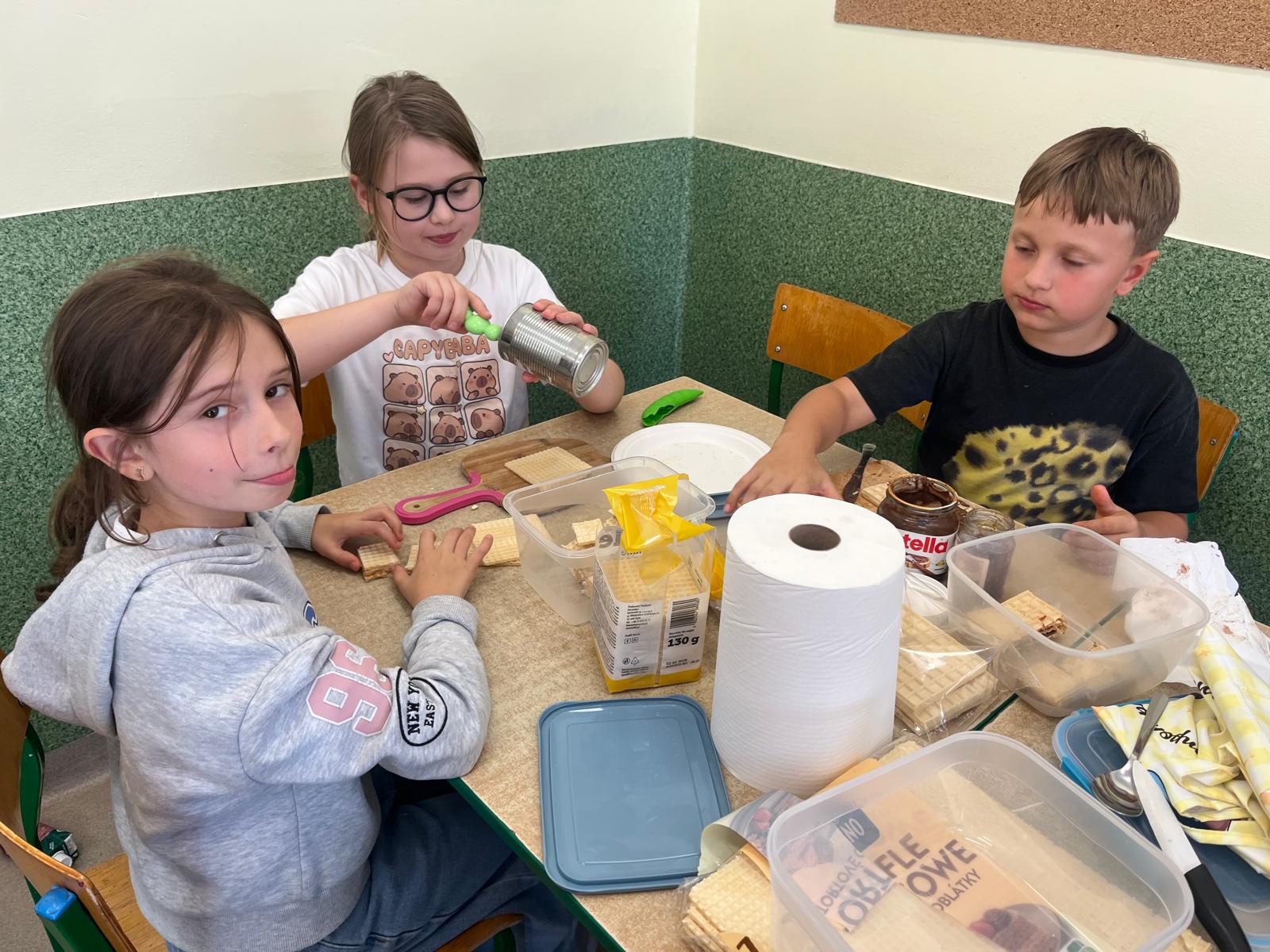 Na zajęciach kulinarnych w ruch poszły wafle małe i wafle duże. Nożyki sprawnie smarowały, a dzieci paluszki oblizywały. Potem równiutko pokroiły i w pudełeczkach umieściły, a w domu rodzinkę ugościły.