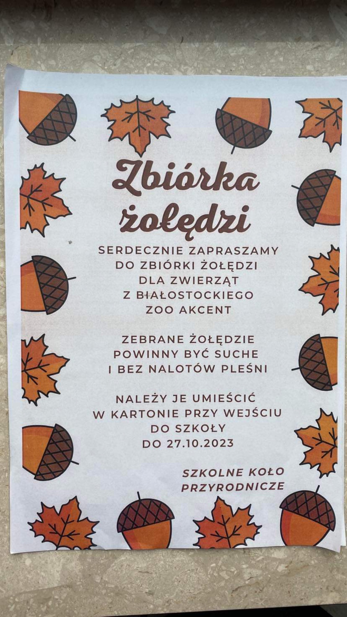 Wszelkie szczegóły znajdują się na plakatach w szkole, a karton na żołędzie umieszczony jest w przedsionku przy wejściu do szkoły.