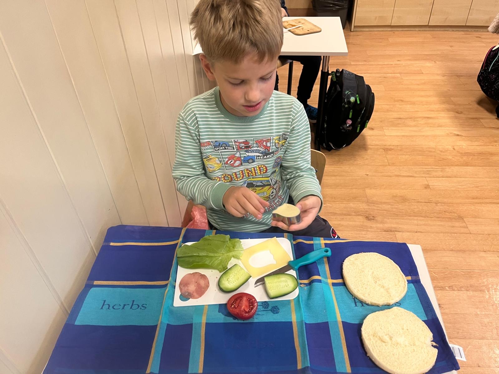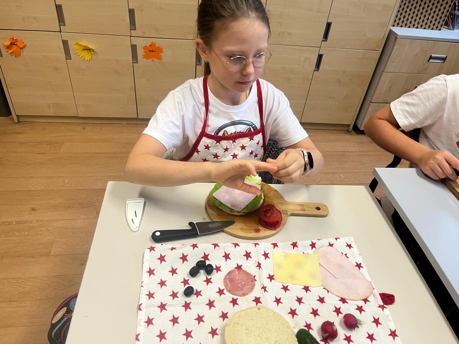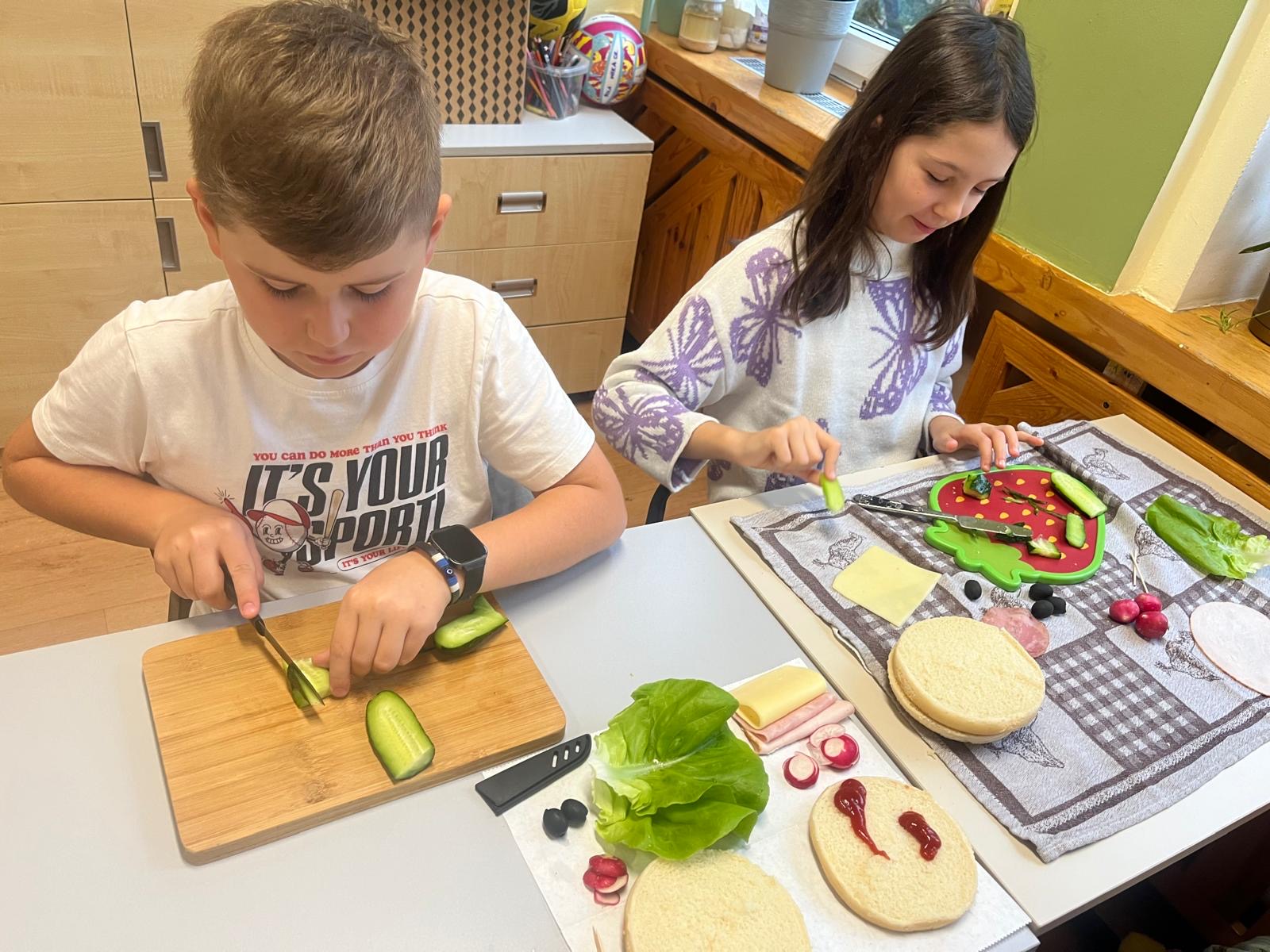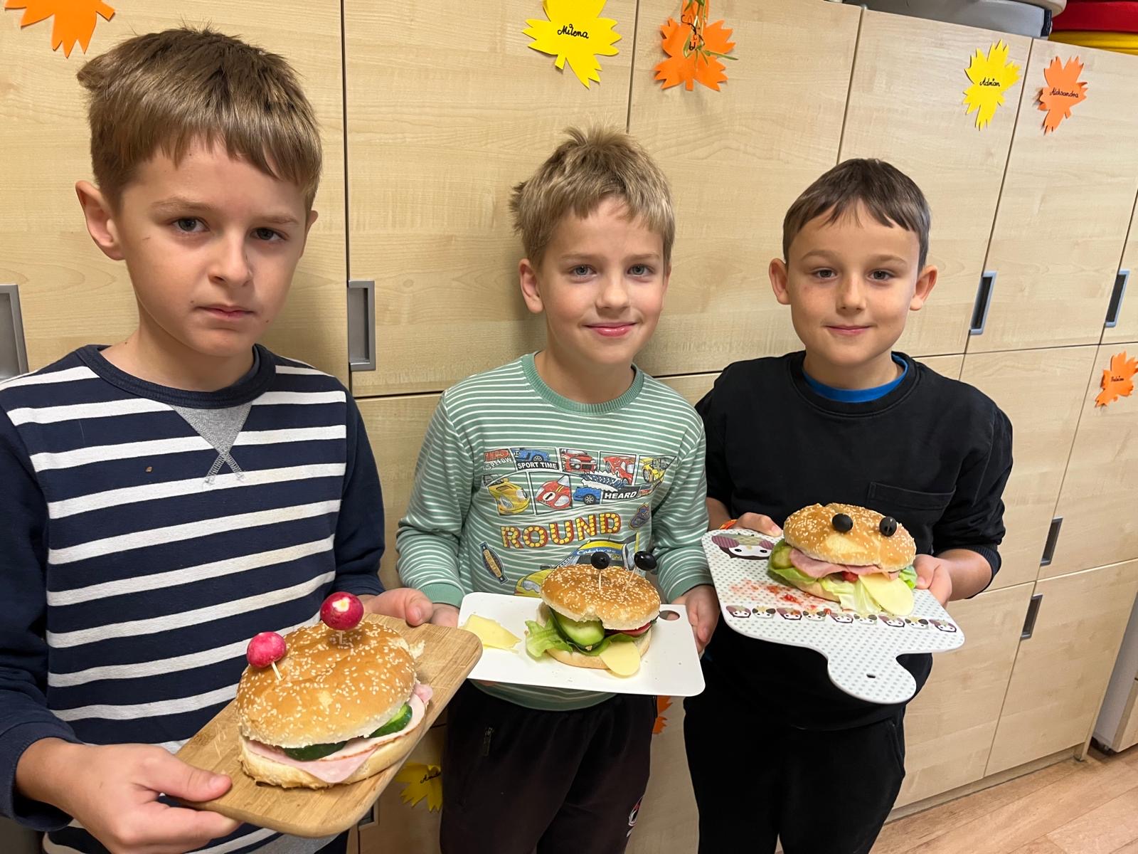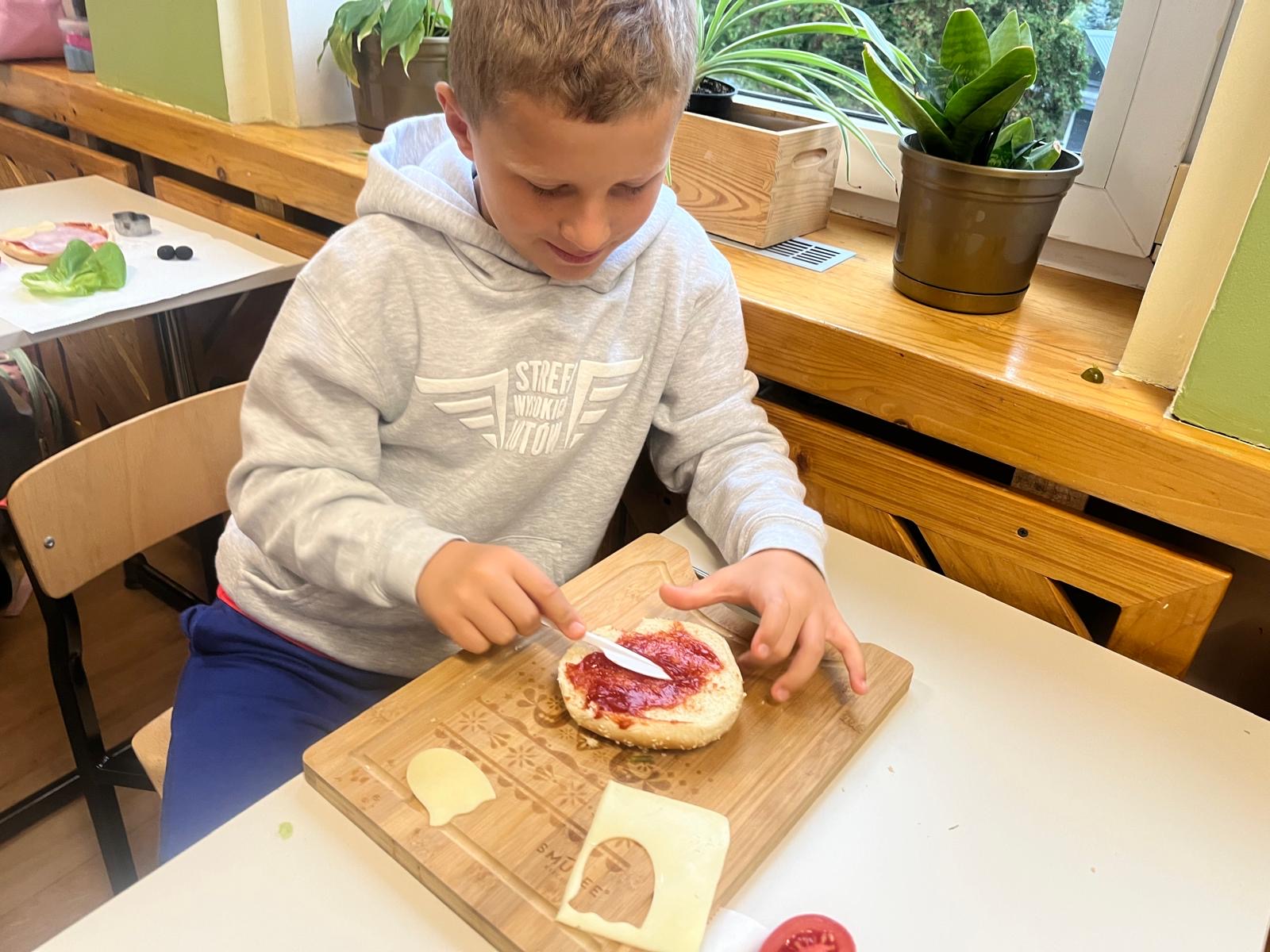 Wrześniowe śniadanie było pełne witamin: pomidorki , ogóreczki, rzodkieweczki, oliwki , soczysta sałata i żółty serek . Wielkie kanapkowe stworki ledwo mieściły się w buziach…ale zmieściły się w brzuszkach.