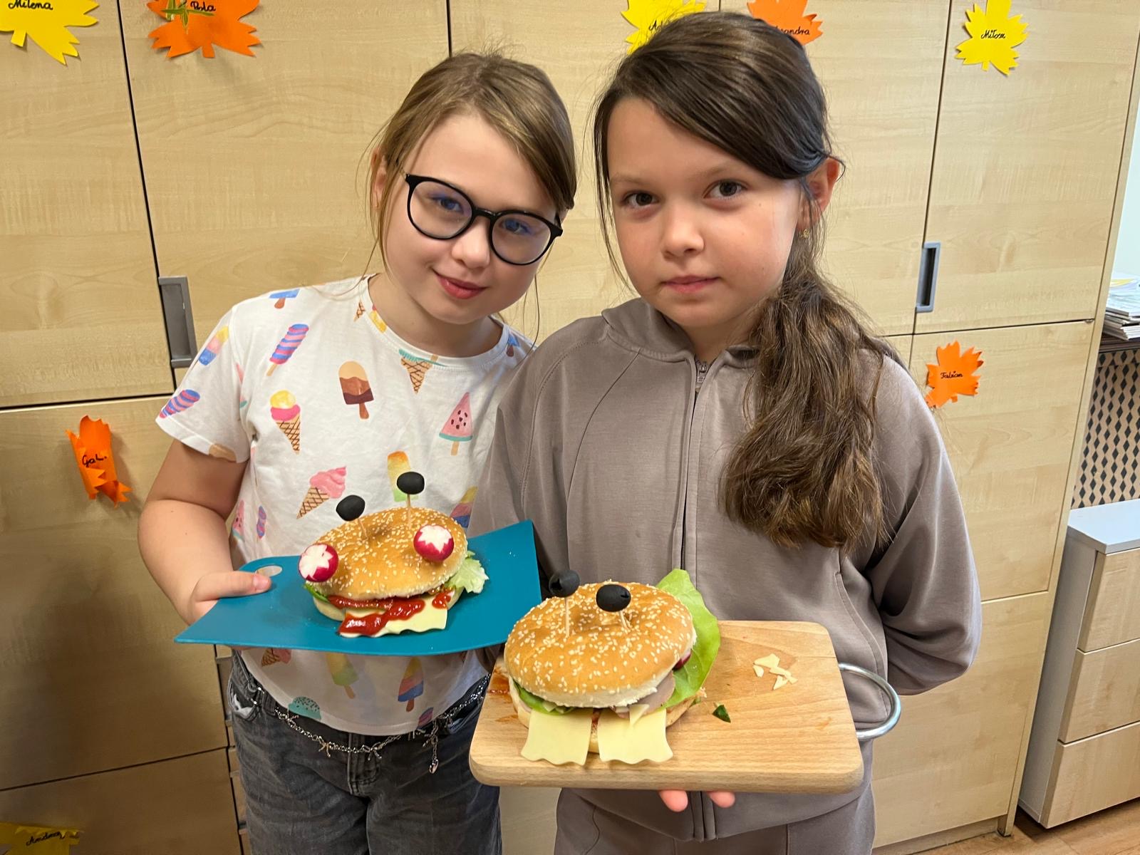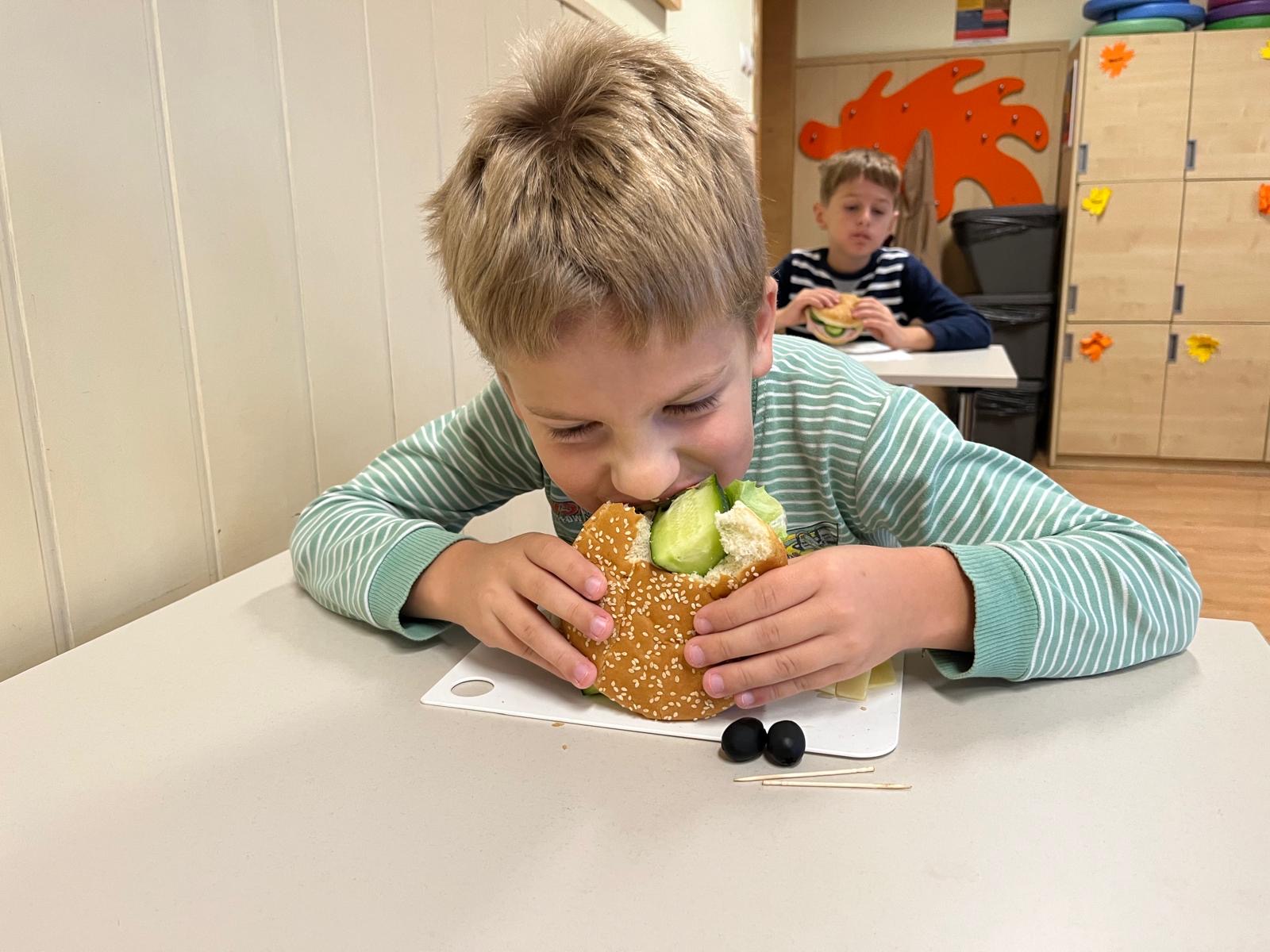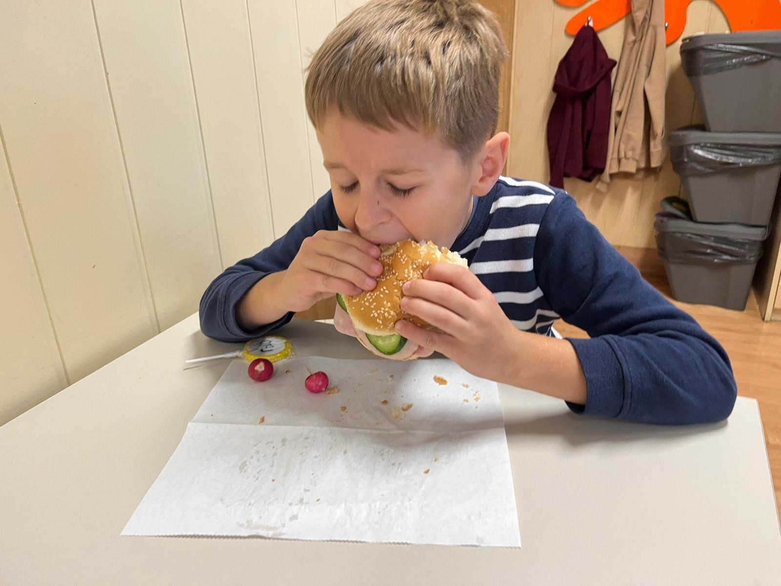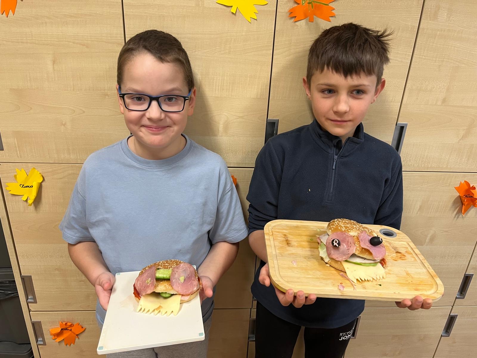 Wrześniowe śniadanie było pełne witamin: pomidorki , ogóreczki, rzodkieweczki, oliwki , soczysta sałata i żółty serek . Wielkie kanapkowe stworki ledwo mieściły się w buziach…ale zmieściły się w brzuszkach.