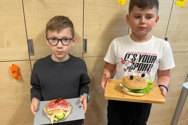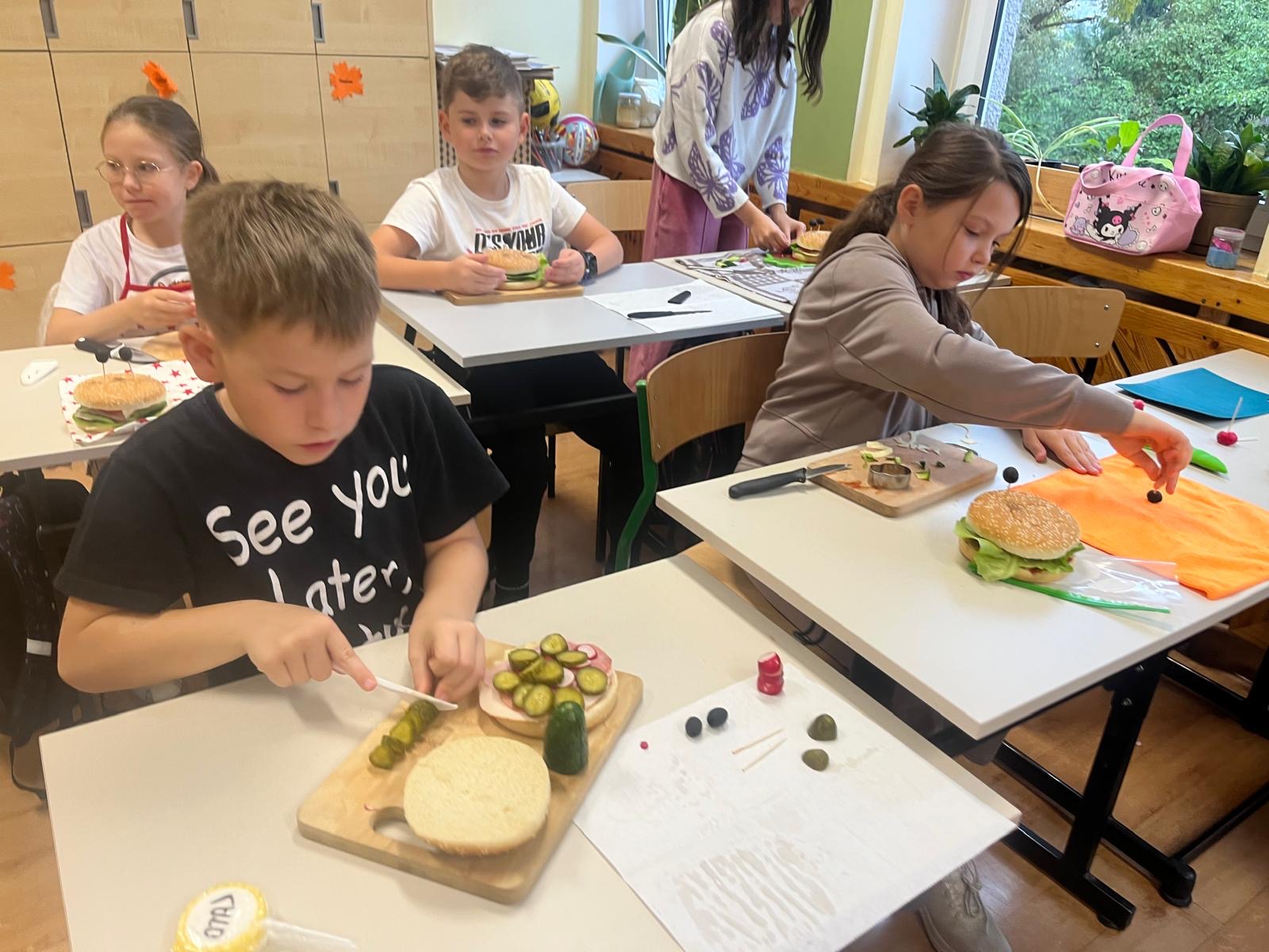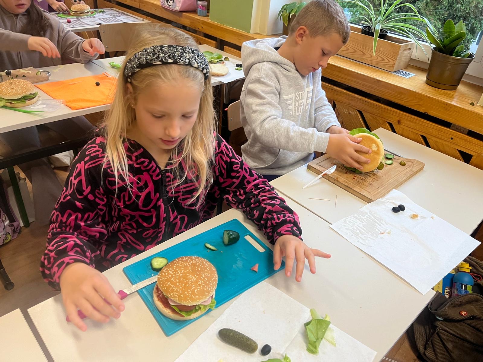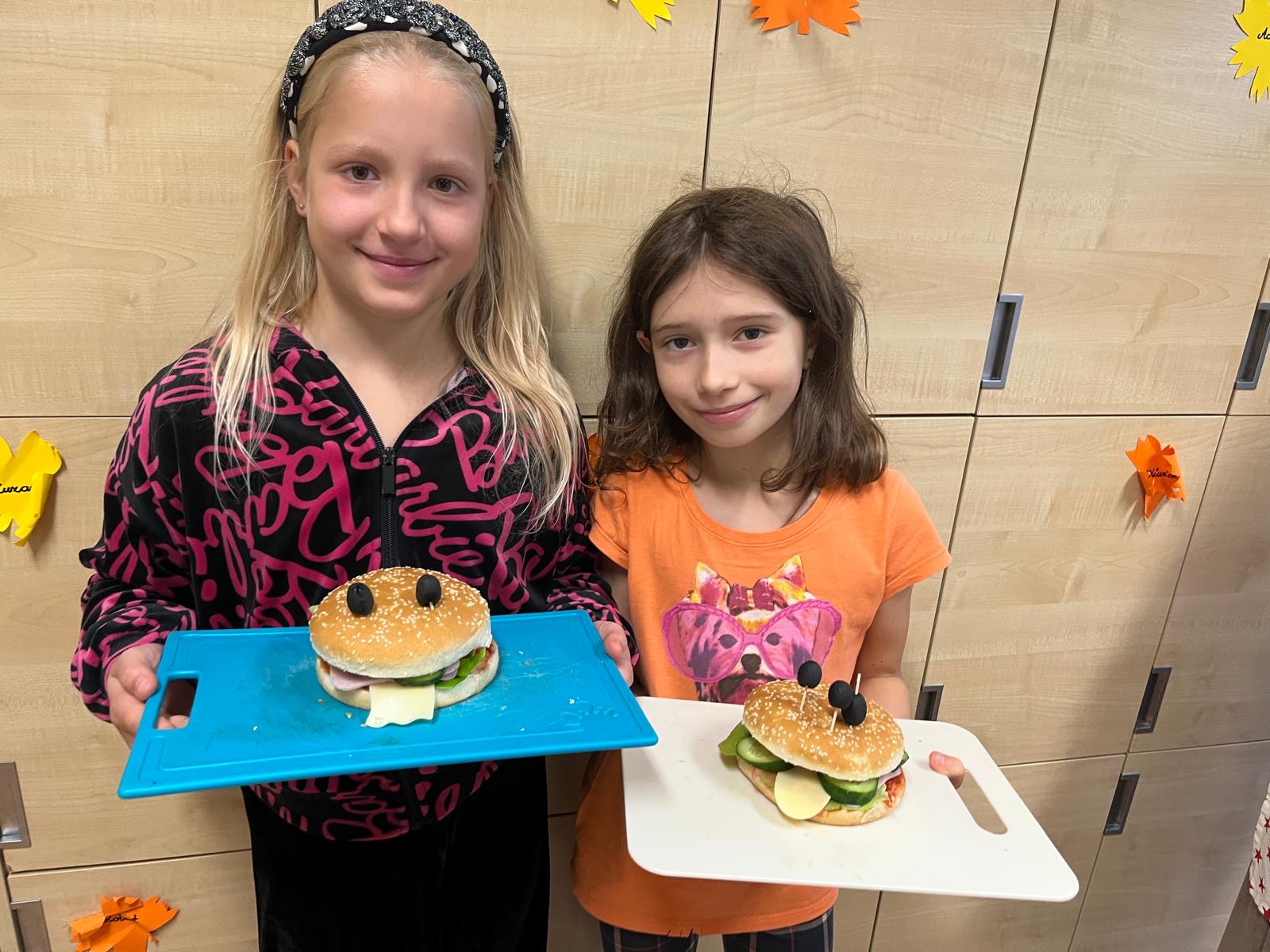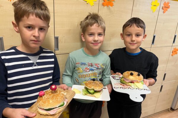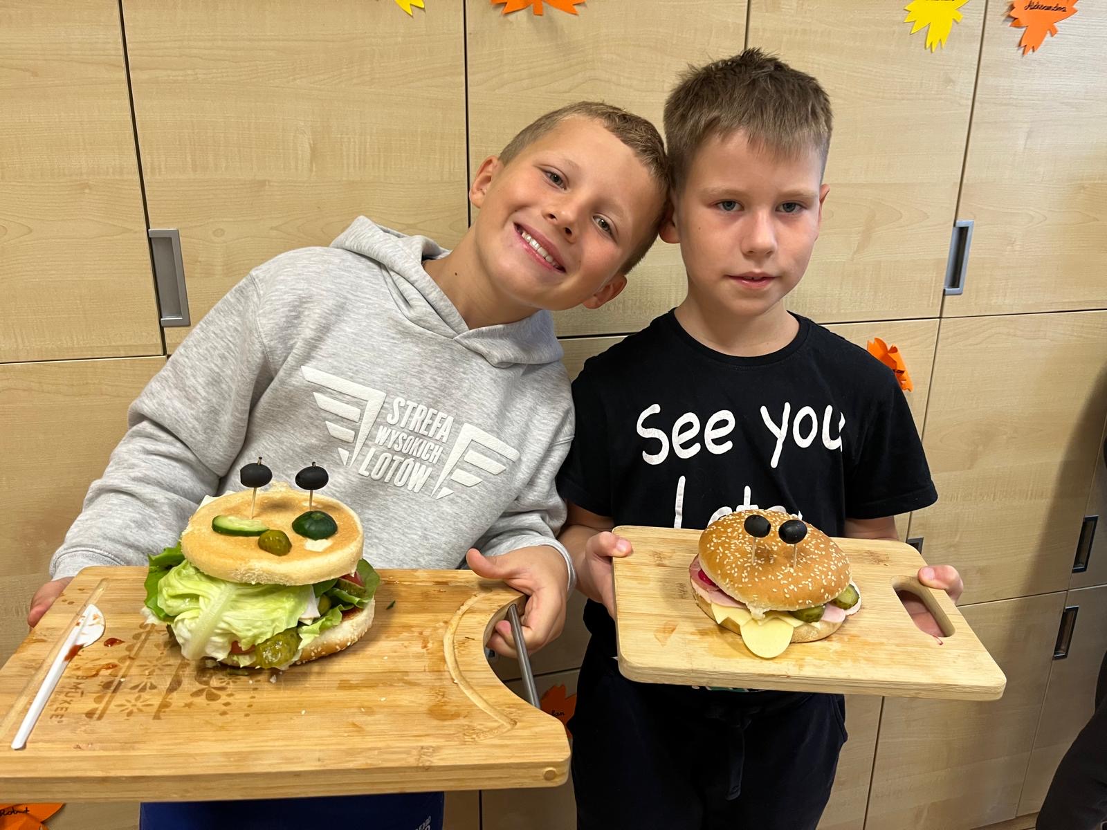 Wrześniowe śniadanie było pełne witamin: pomidorki , ogóreczki, rzodkieweczki, oliwki , soczysta sałata i żółty serek . Wielkie kanapkowe stworki ledwo mieściły się w buziach…ale zmieściły się w brzuszkach.