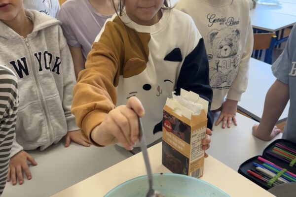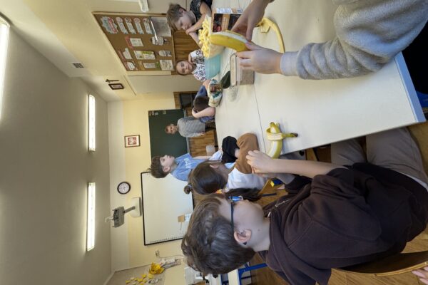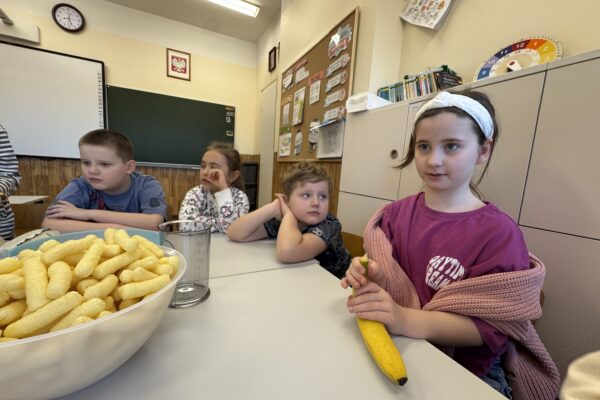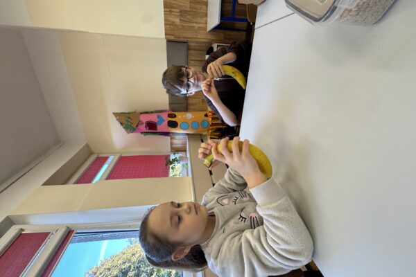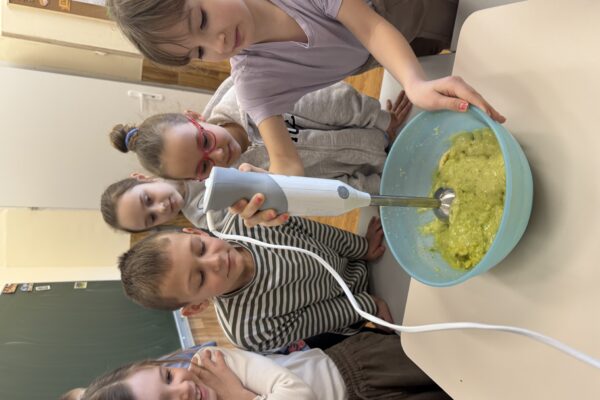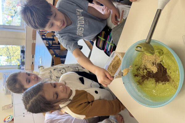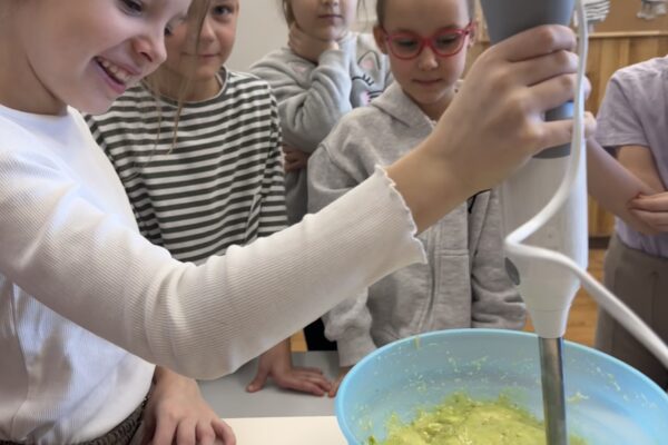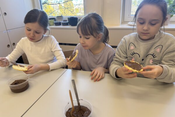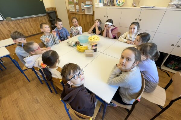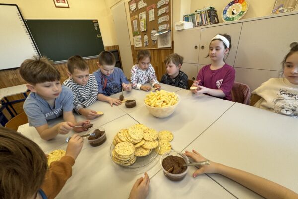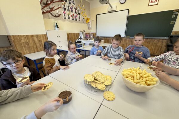 Uczniowie klasy 1b kontynuują swoją comiesięczną tradycję przygotowywania zdrowych śniadań.
