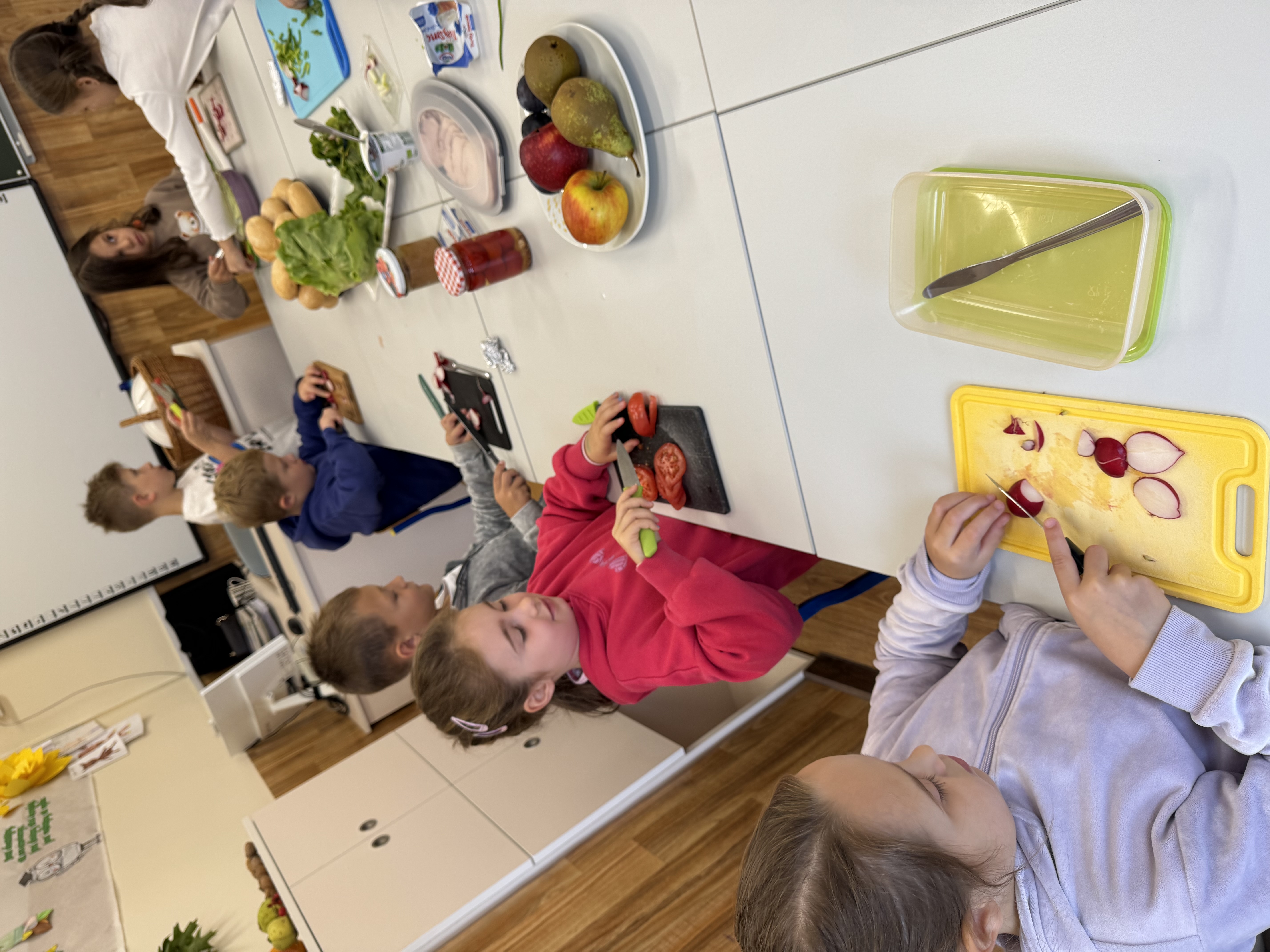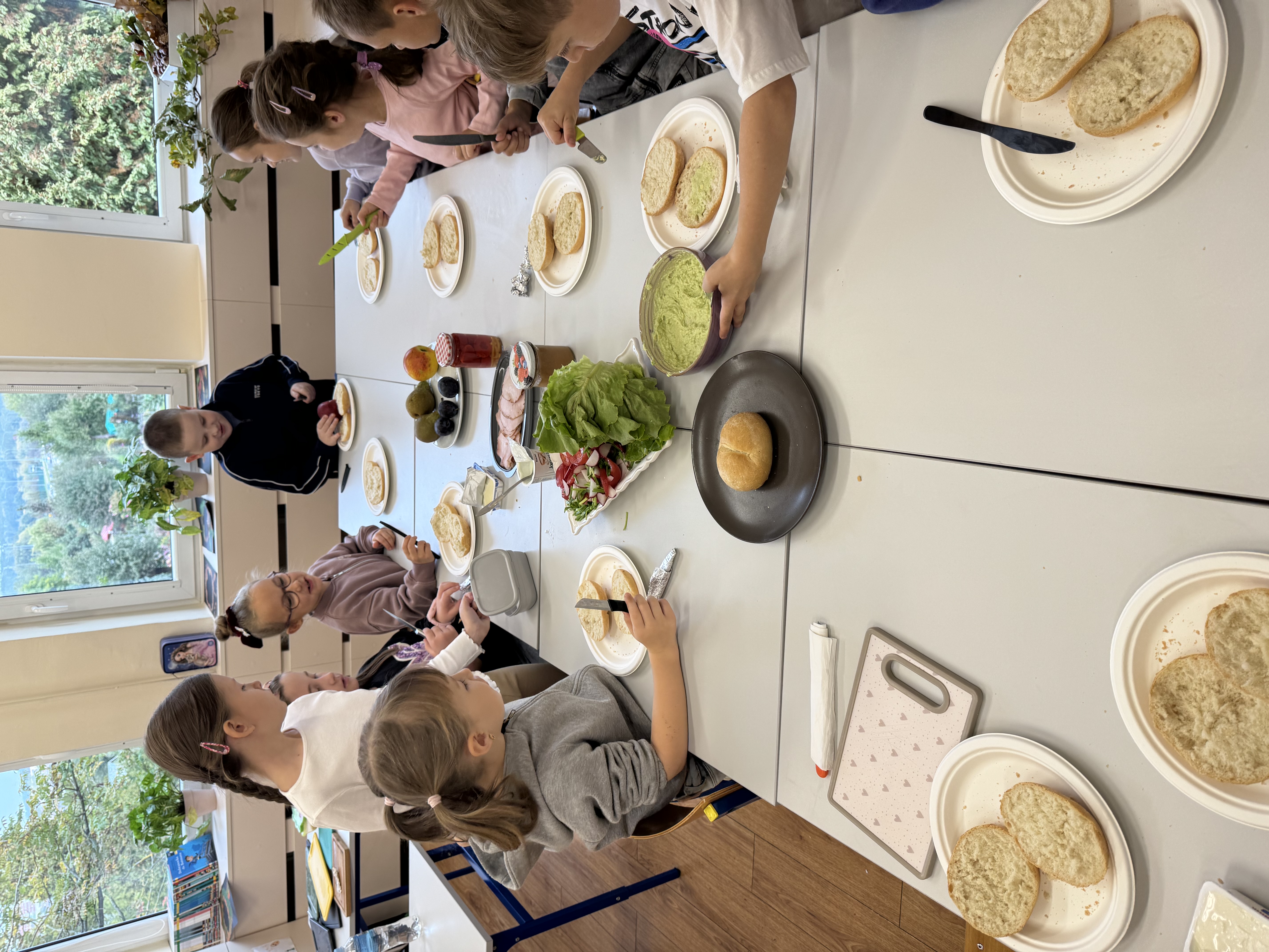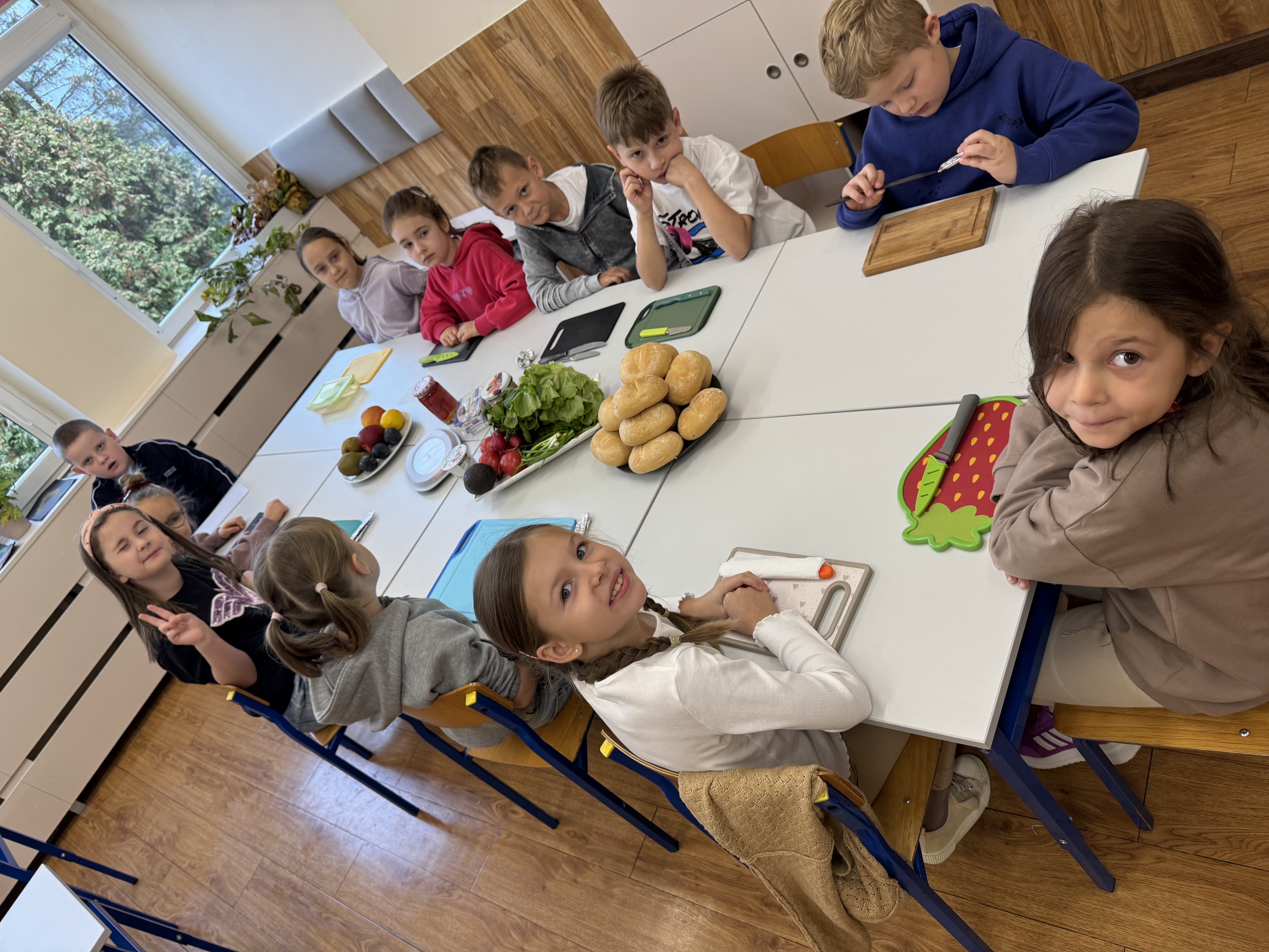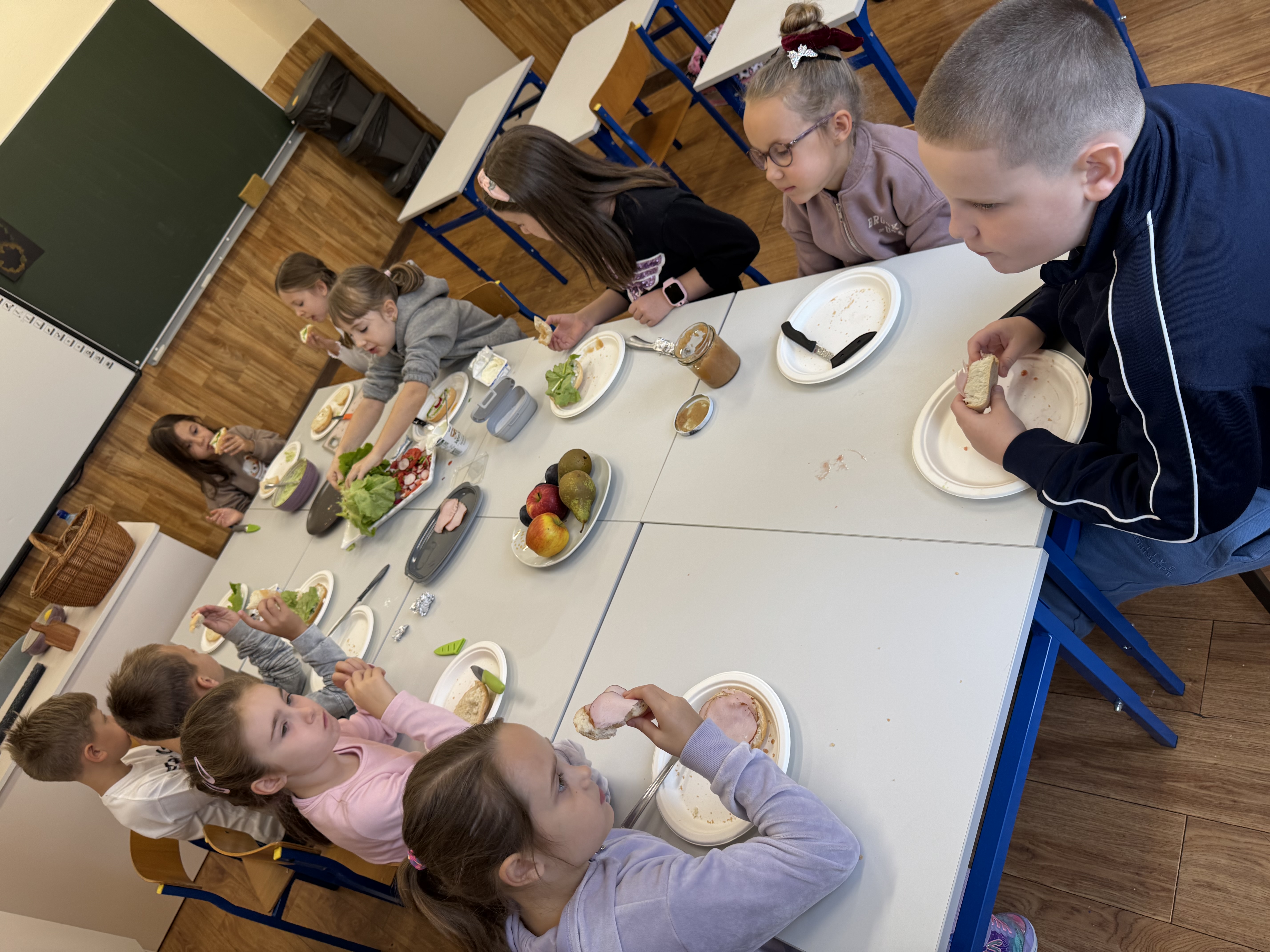 Uczniowie klasy 1b rozpoczęli swoją przygodę ze zdrowymi, wspólnymi śniadaniami. W każdy pierwszy wtorek miesiąca, pierwszoklasiści będą samodzielnie przygotowywać pożywne smakołyki. Ważnym elementem naszych śniadań jest możliwość zjedzenia posiłku przy wspólnym stole, co sprzyja budowaniu relacji, współpracy oraz kształtowaniu zdrowych nawyków żywieniowych.