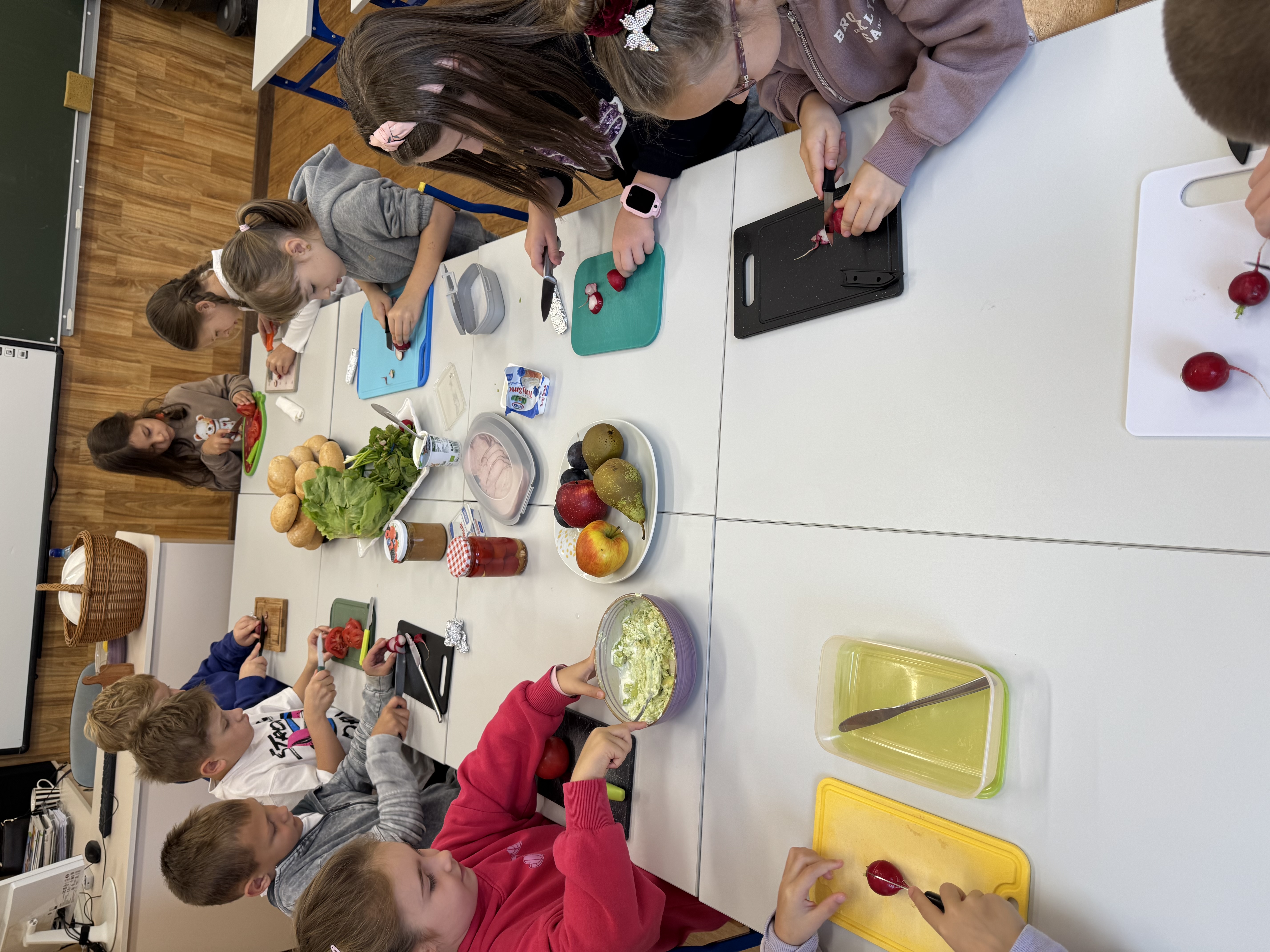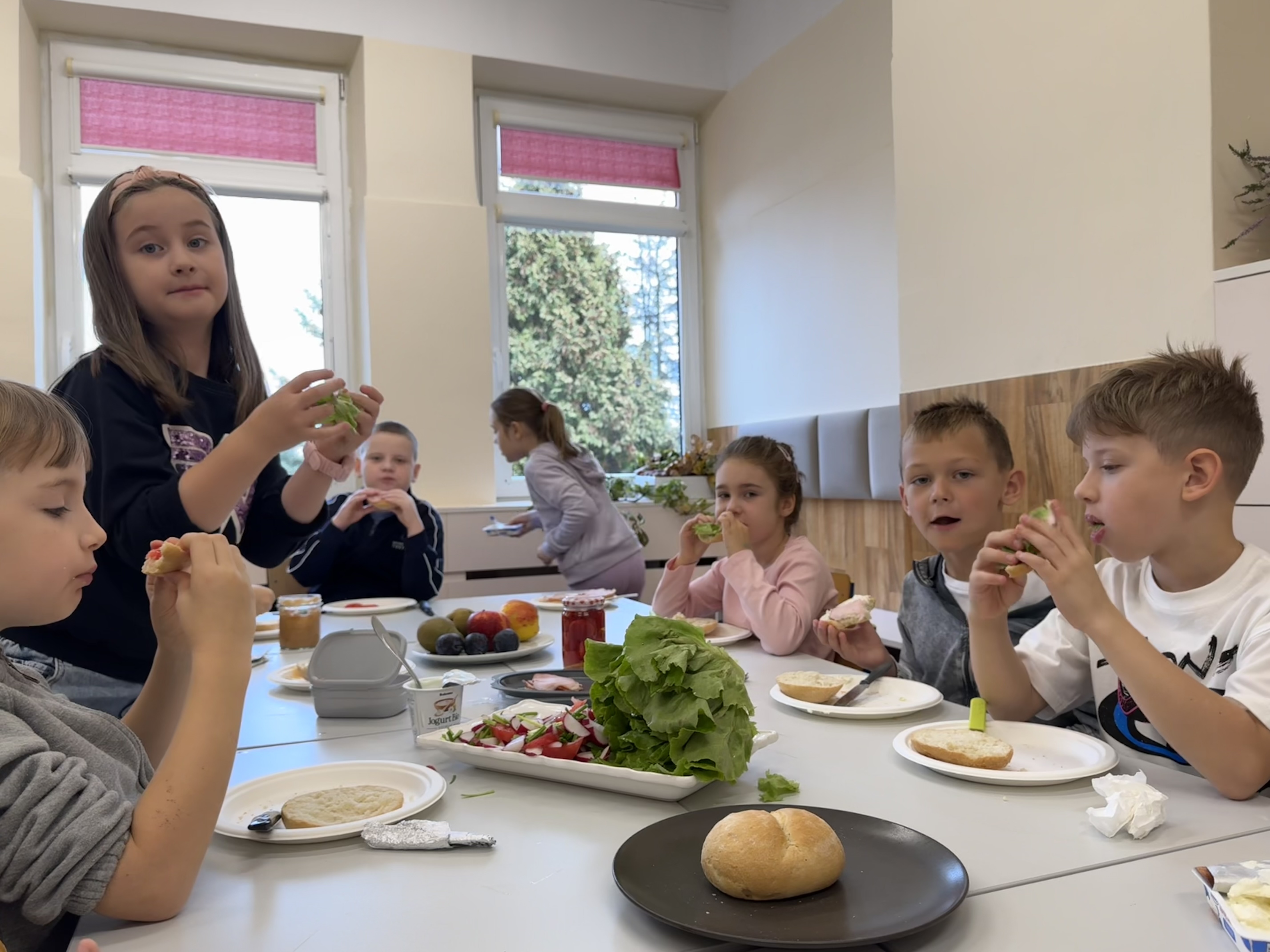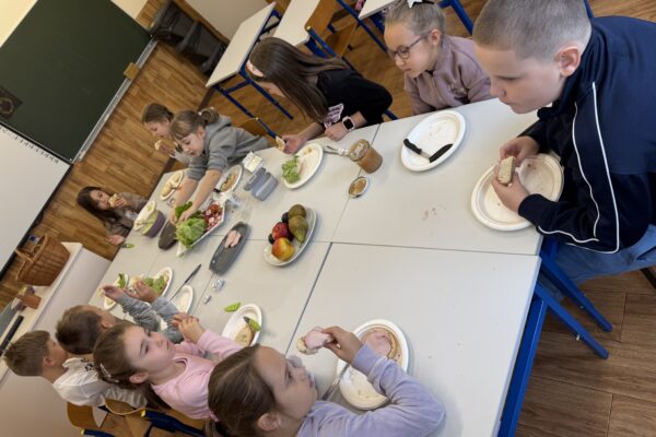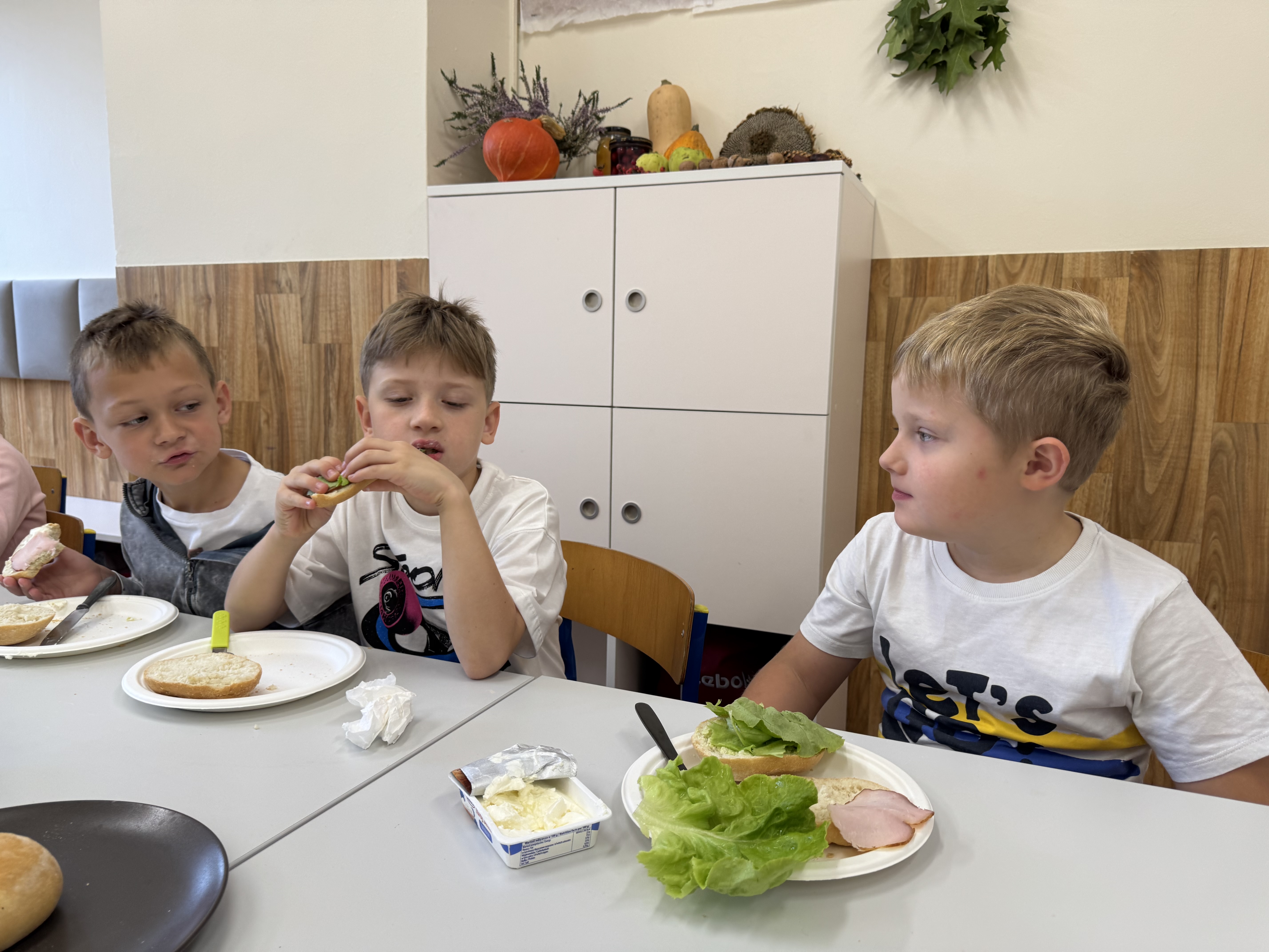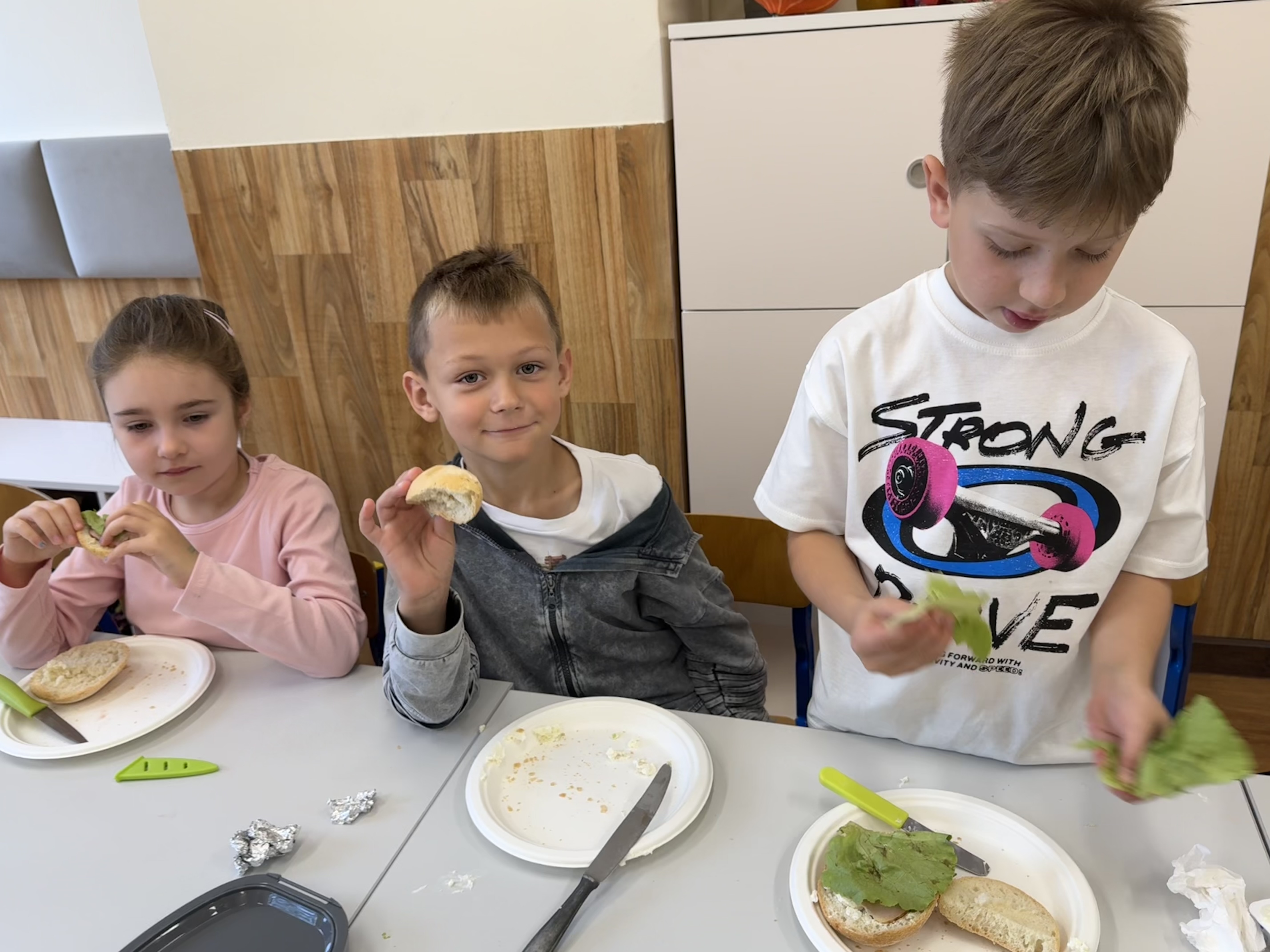 Uczniowie klasy 1b rozpoczęli swoją przygodę ze zdrowymi, wspólnymi śniadaniami. W każdy pierwszy wtorek miesiąca, pierwszoklasiści będą samodzielnie przygotowywać pożywne smakołyki. Ważnym elementem naszych śniadań jest możliwość zjedzenia posiłku przy wspólnym stole, co sprzyja budowaniu relacji, współpracy oraz kształtowaniu zdrowych nawyków żywieniowych.