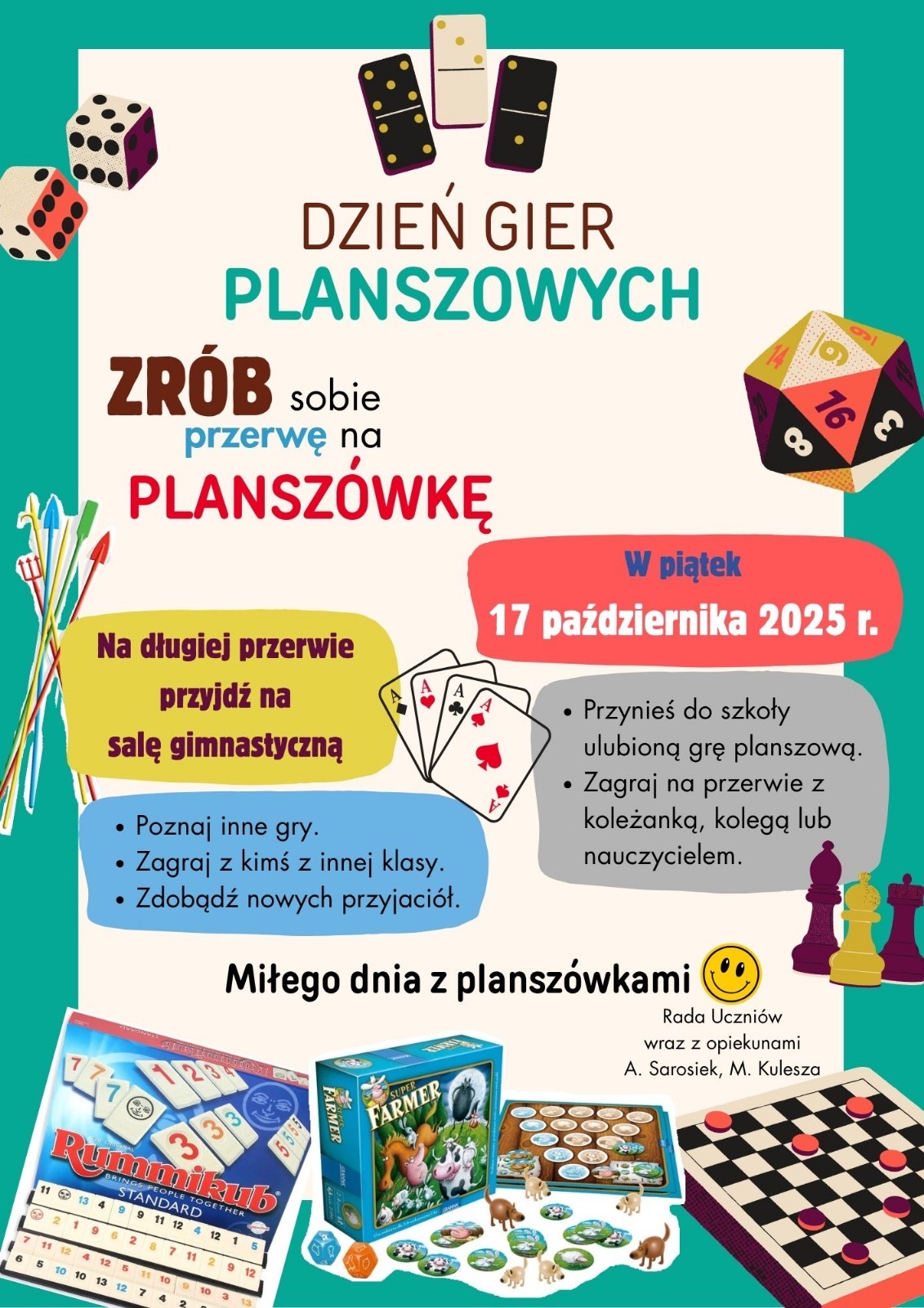Ponadto, na długiej przerwie zapraszamy wszystkich chętnych uczniów na salę gimnastyczną, gdzie przedstawiciele Rady Uczniów oraz wolontariusze z klasy VIII poprowadzą warsztaty gry w mniej lub bardziej znane planszówki.