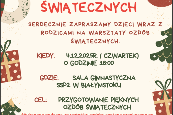 Drodzy rodzice i uczniowie, zapraszamy serdecznie do udziału w warsztatach świątecznych, które odbędą się 4 grudnia o godzinie 16:00 w sali gimnastycznej naszej szkoły. Podczas warsztatów wykonamy różne ozdoby świąteczne, które zostaną przekazane na szkolny…
