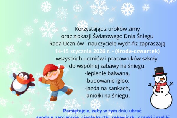 W dniach 14-15 stycznia 2026 r. w naszej szkole będziemy obchodzili Światowy Dzień Śniegu. W tych dniach Rada Uczniów oraz nauczyciele wych-fiz zapraszają uczniów i pracowników do korzystania z uroków zimy i wspólnych zabaw na…